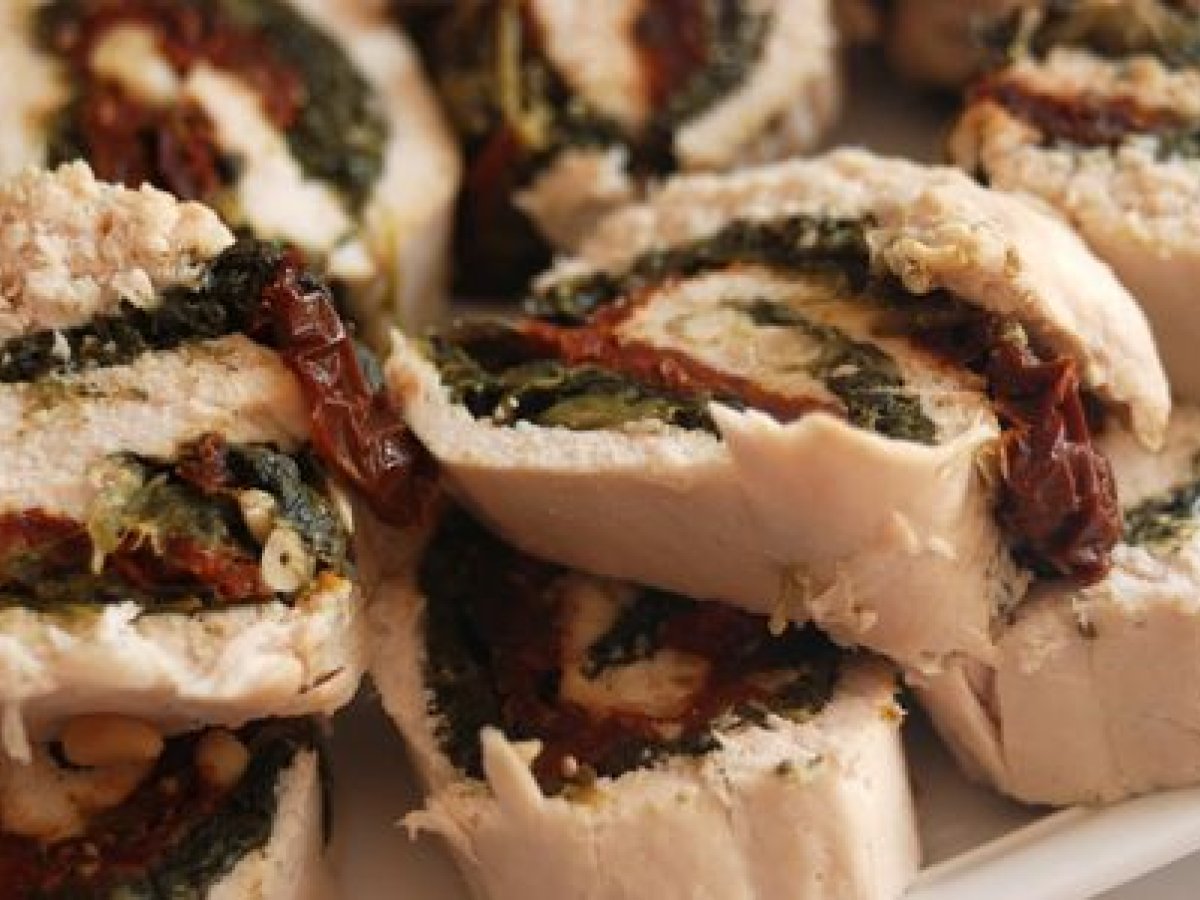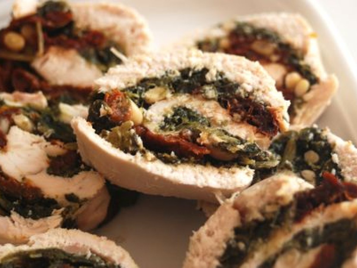 Roulé de poulet aux épinards, tomates séchées et pignons