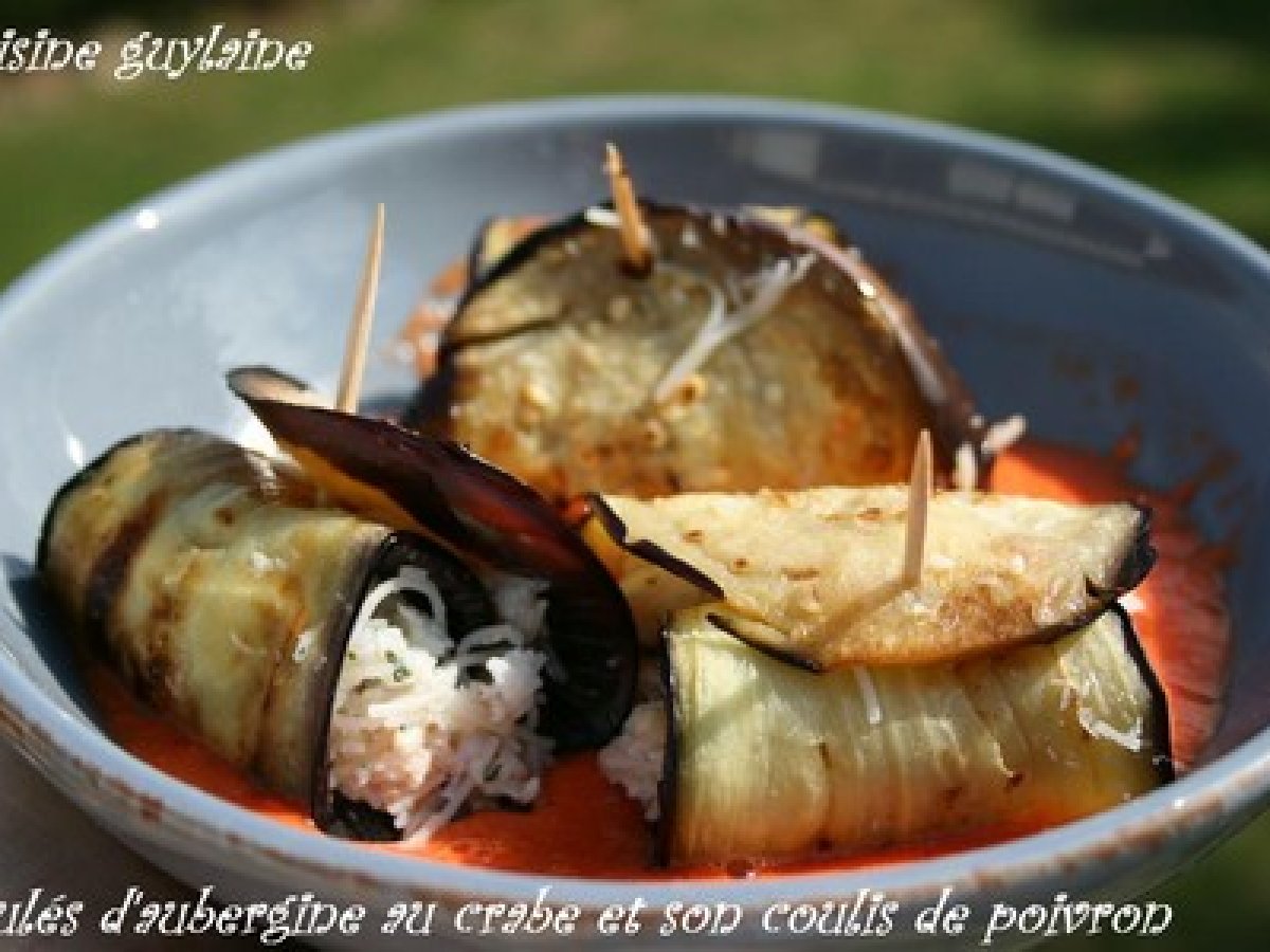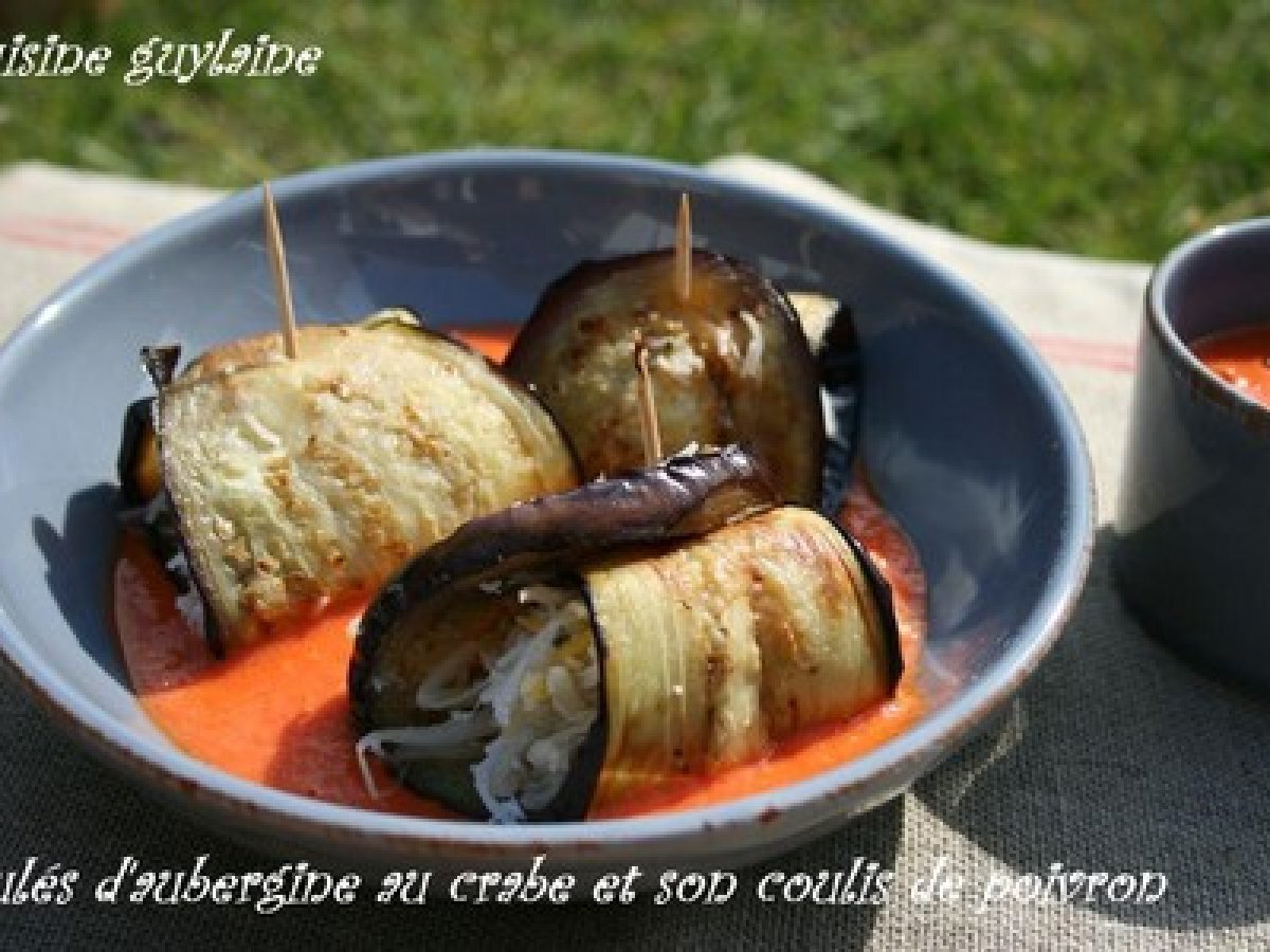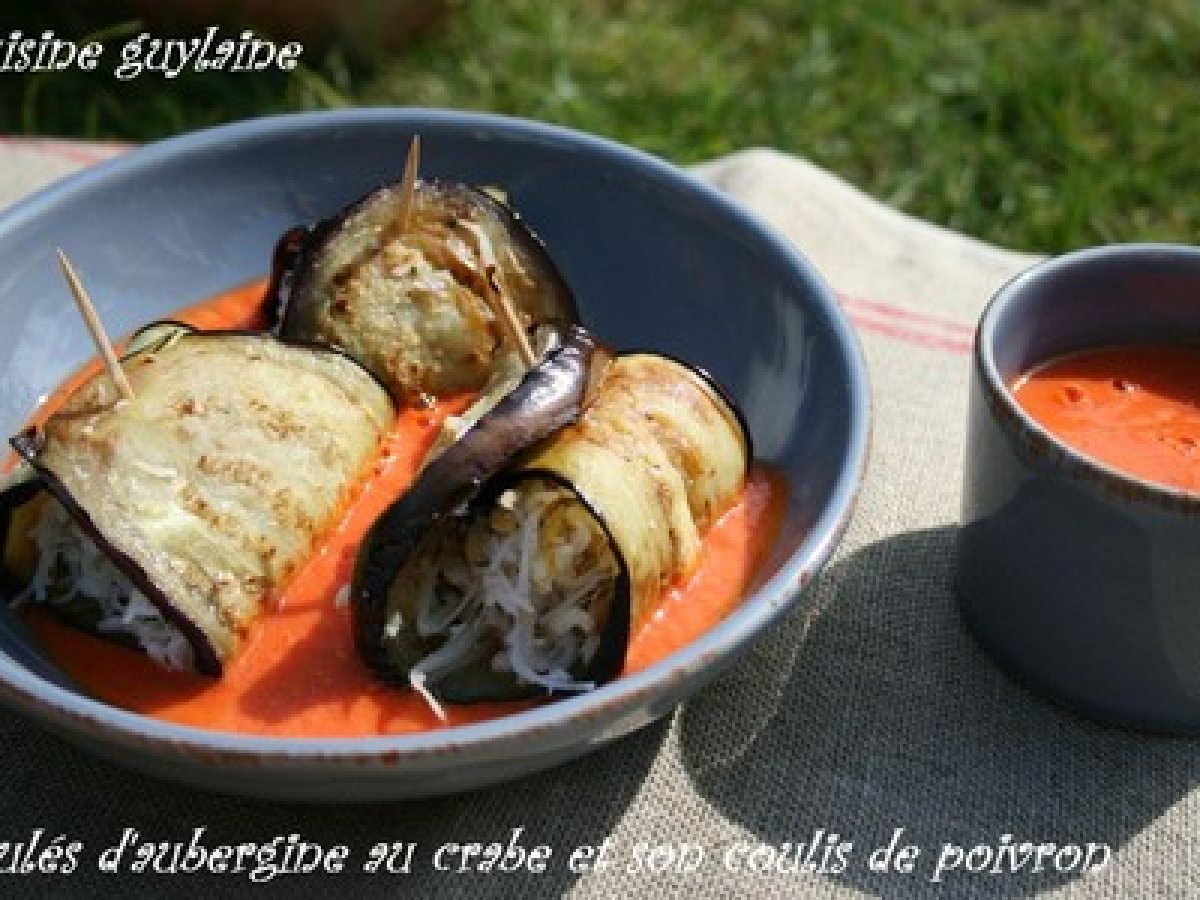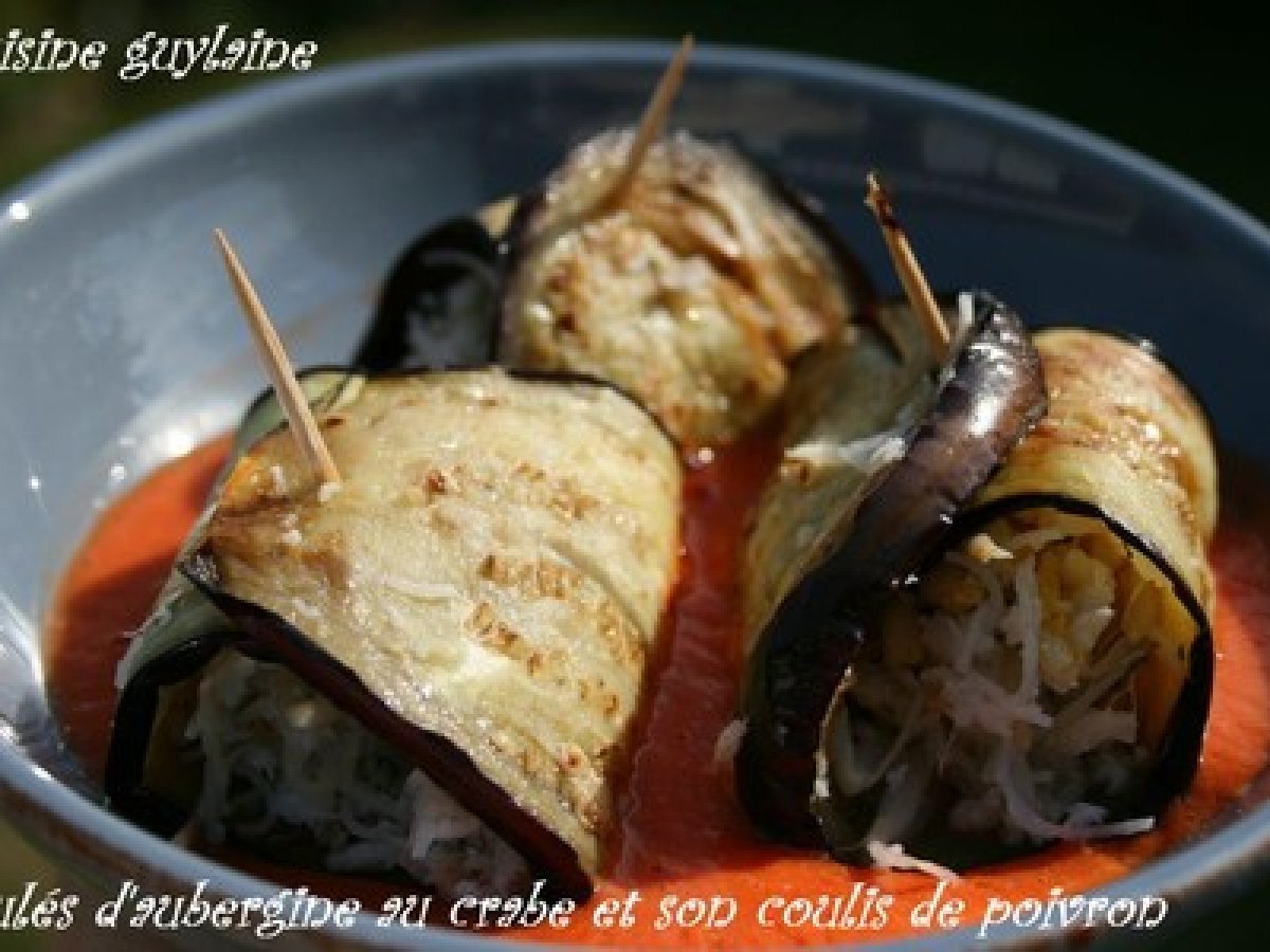 Roulés d'aubergine au crabe et son coulis de poivron