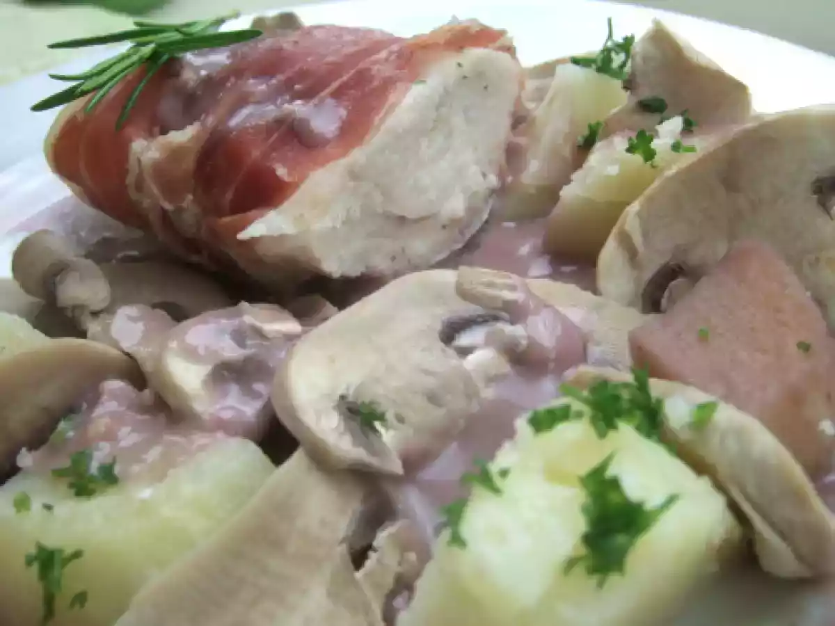 Roulés de blanc de poulet en robe de jambon sauce au vin