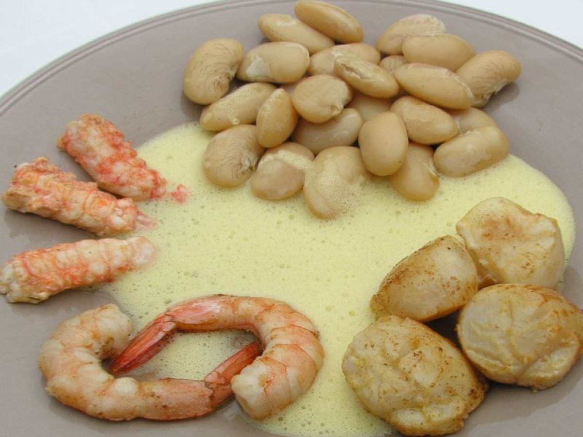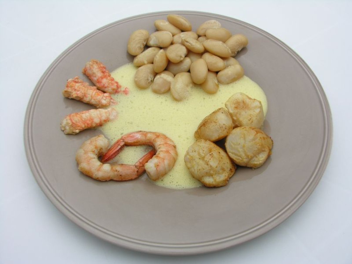 Sabayon fruits de la passion aux saint-jacques, langoustines et haricots de soissons PrécédentSuivant Platfacile2 h 20 m490 Kcal Envoyer cette recette à un ami Imprimer cette page Poser une question à l'auteur Publier votre photo de cette recette Ingrédients 4 16 noix de Saint-Jacques 12 langoustines 8 gambas 7 fruits de la passion 350 g de Haricots de Soissons 1 carotte 1 blanc de poireau 1 oignon 1 branche de céleri 7 brins de thym frais 6 feuilles de laurier persil plat 3 jaunes d’oeufs Huile d'olive Sel poivre