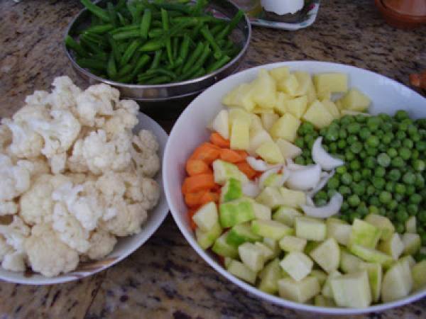Couper les carottes , les pommes de terre , les courgettes et les oignons en petits dés , supprimer les filandres des haricots verts et détailler le chou fleur en petits bouquets.