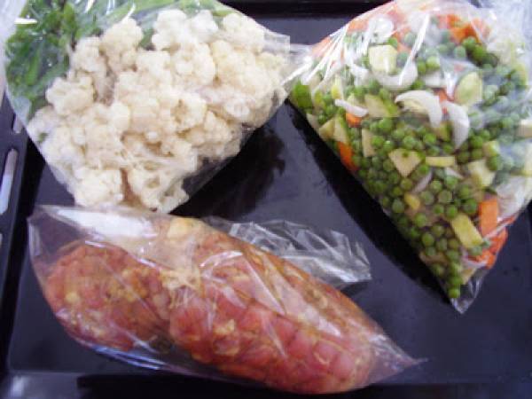 Pour les petits poids , les égrener la veille pour gagner du temps. Ensuite assaisonner les deux petits rôtis de poulet de sel , poivre , curry et sumac, placer. Les légumes en dés dans un sachet cuisson avec une noix de beurre , du sel et du poivre.- Idem pour les haricots verts et le choux.