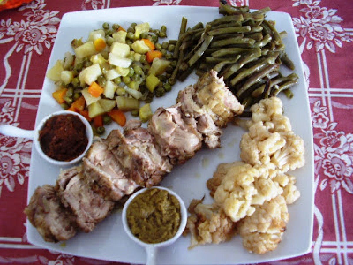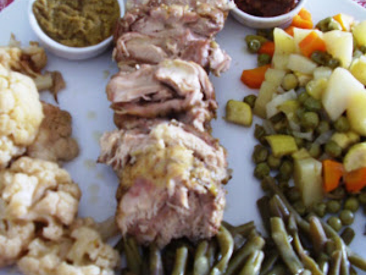 - Ensuite dresser les rôtis coupés en tranches sur un plat de service , accompagnés des légumes, nappés de sauce et avec de la moutarde et de l'harissa pour ceux qui veulent relever ce plat