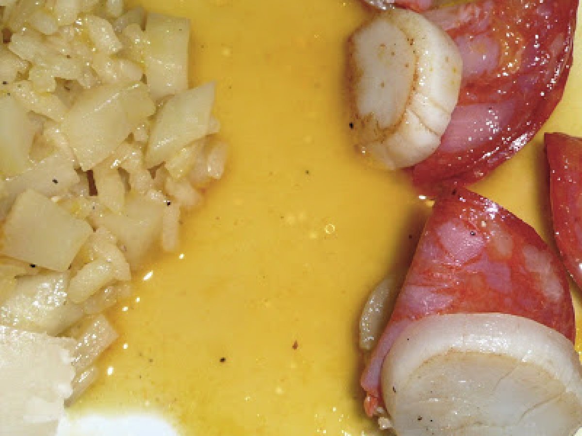 Saint-jacques au chorizo - risotto au topinambour et à l'orange Platfacile37 min Envoyer cette recette à un ami Imprimer cette page Poser une question à l'auteur Publier votre photo de cette recette Ingrédients 4 Le risotto : 240 grammes de riz à risotto (ici arborio) 2 échalotes 8 topinambours de taille moyenne Le jus d'une orange 15 cl de vin blanc type nouilly Eau chaude Persil Sel et poivre 70 grammes de parmesan 30 grammes de beurre Les saint jacques :