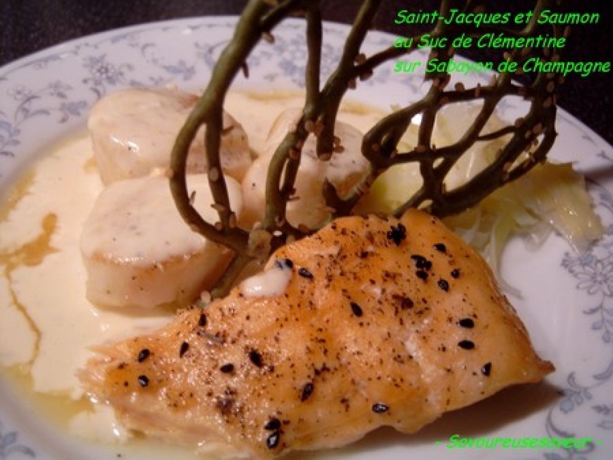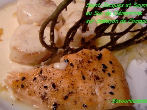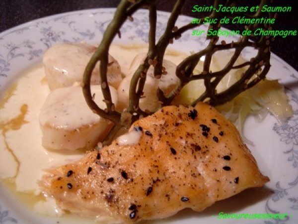 Saint-jacques et saumon en suc de clémentine et sabayon de champagne PrécédentSuivant Platfacile35 min Envoyer cette recette à un ami Imprimer cette page Poser une question à l'auteur Publier votre photo de cette recette Une recette de saveur pour satisfaire toutes les papilles. Ingrédients 12 750 g de saumon dans le coeur 36 belles noix de St Jacques sans corail le jus de 24 clémentines le jus de 2 citrons l'écorce d'un citron en râpée 6 blancs de poireaux 3 cuillères à café de poivre noir concassé 3 cuillères à café de carvi huile d'olive 6 jaunes d'oeuf 15 cl de champagne 45 cl de cr fraîche à battre Pour le croquant aux épinards: 100 g d'épinards en purée 50 g de farine 1 cuillère à soupe d'huile de sésame grillé fleur de sel sésame grillé