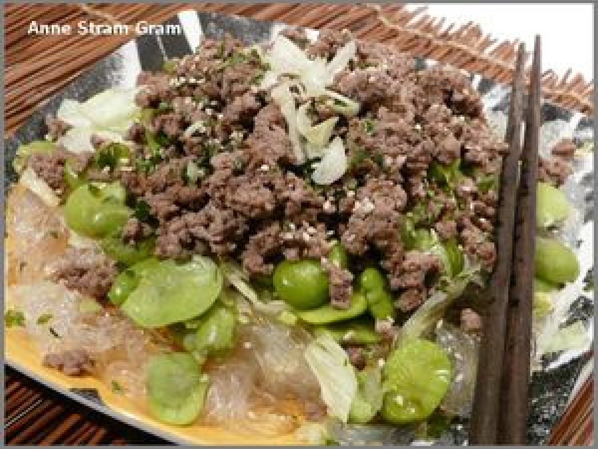 Salade au boeuf hâché et aux fèves, aux saveurs asiatiques Platfacile30 min Envoyer cette recette à un ami Imprimer cette page Poser une question à l'auteur Publier votre photo de cette recette Ingrédients 2 100 g de vermicelles de soja 250 g de viande de boeuf hâchée 150 g de fèves surgelées, sans peau 150 g de laitue iceberg 1 gousse d'ail 1 cuillère à soupe de coriandre ciselée 2 cuillères à soupe de jus de citron 2 cuillères à soupe de nuoc mam 1 cuillère à soupe de sauce soja douce 1 cuillère à café de miel liquide 1 pincée de piment en poudre 1 cuillère à café d'huile neutre 2 pincées de graines de sésame sel poivre blanc du moulin