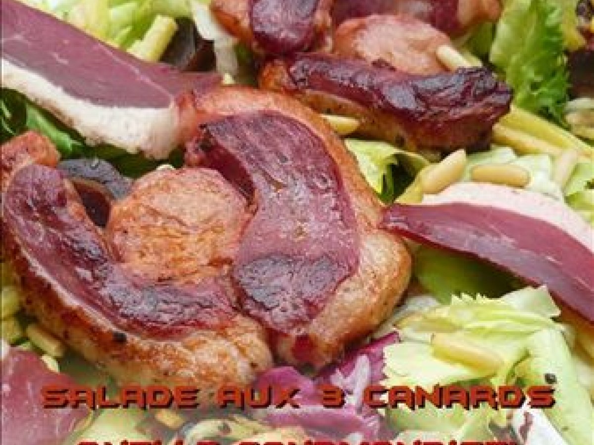 Salade aux 3 canards votez maintenant Platfacile30 min2359 Kcal Envoyer cette recette à un ami Imprimer cette page Poser une question à l'auteur Publier votre photo de cette recette Ingrédients 3 3 médaillons de canard au foie gras gésiers de canard confits magret fumé séché mélange de salade 2 gousses d'ail 1 pomme de terre pignons de pin vinaigrette