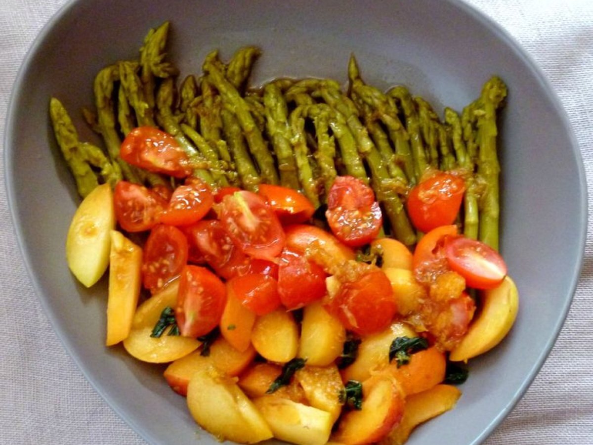 Salade d'asperges tomates abricots & basilic, sauce orange et vinaigre balsamique