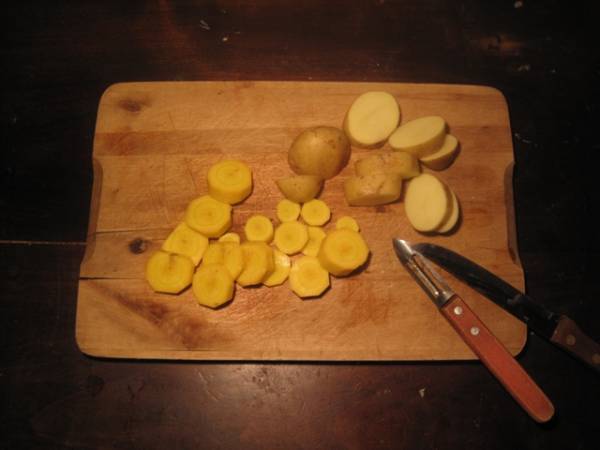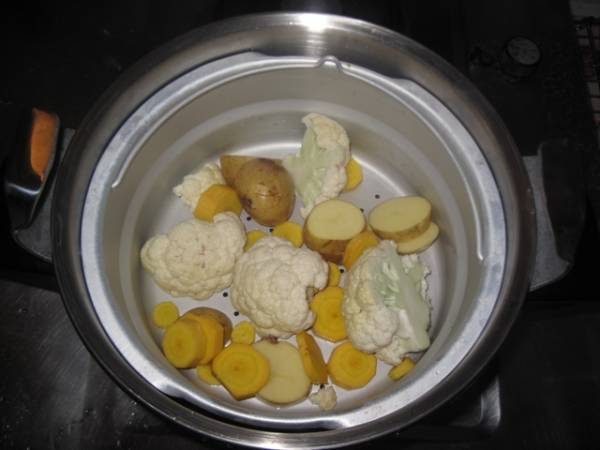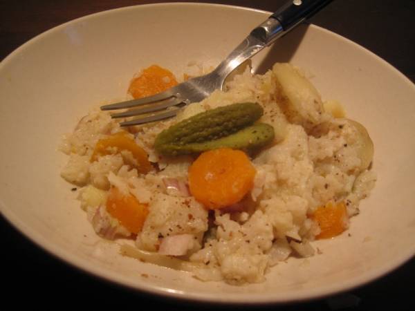 Ma provision pantagruélique contient, entre autres, un chou-fleur et quelques carottes. Avec, comme personnages secondaires des pommes de terre, des échalottes et quelques cornichons, je vous présente la grande, la merveilleuse, l'époustouflante salade de chou-fleur au vinaigre de cidre.