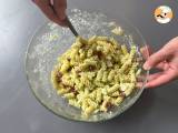 Transférez les pâtes dans un saladier et ajoutez 4 cuillères à soupe de pesto de courgettes. Bien mélanger à l'aide de 2 cuillères, puis ajoutez la mozzarella, les tomates séchées, le poivre, le sel et un filet d'huile d'olive.