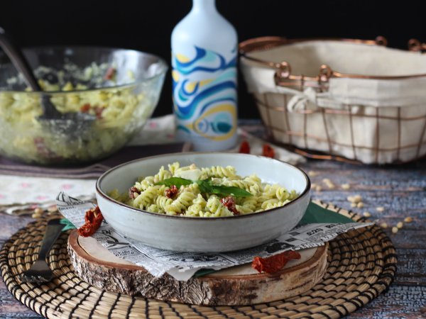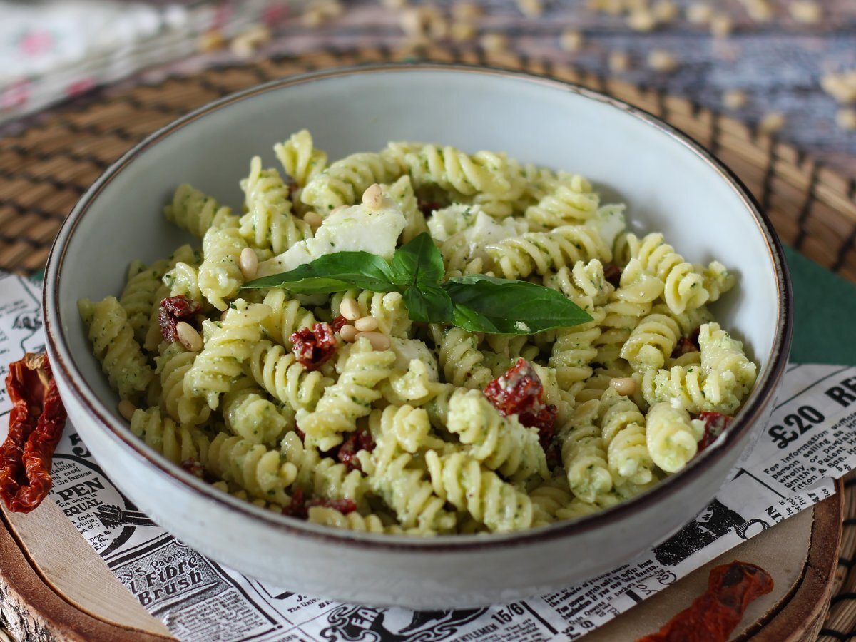Salade de pâtes au pesto de courgettes, mozzarella et tomates séchées