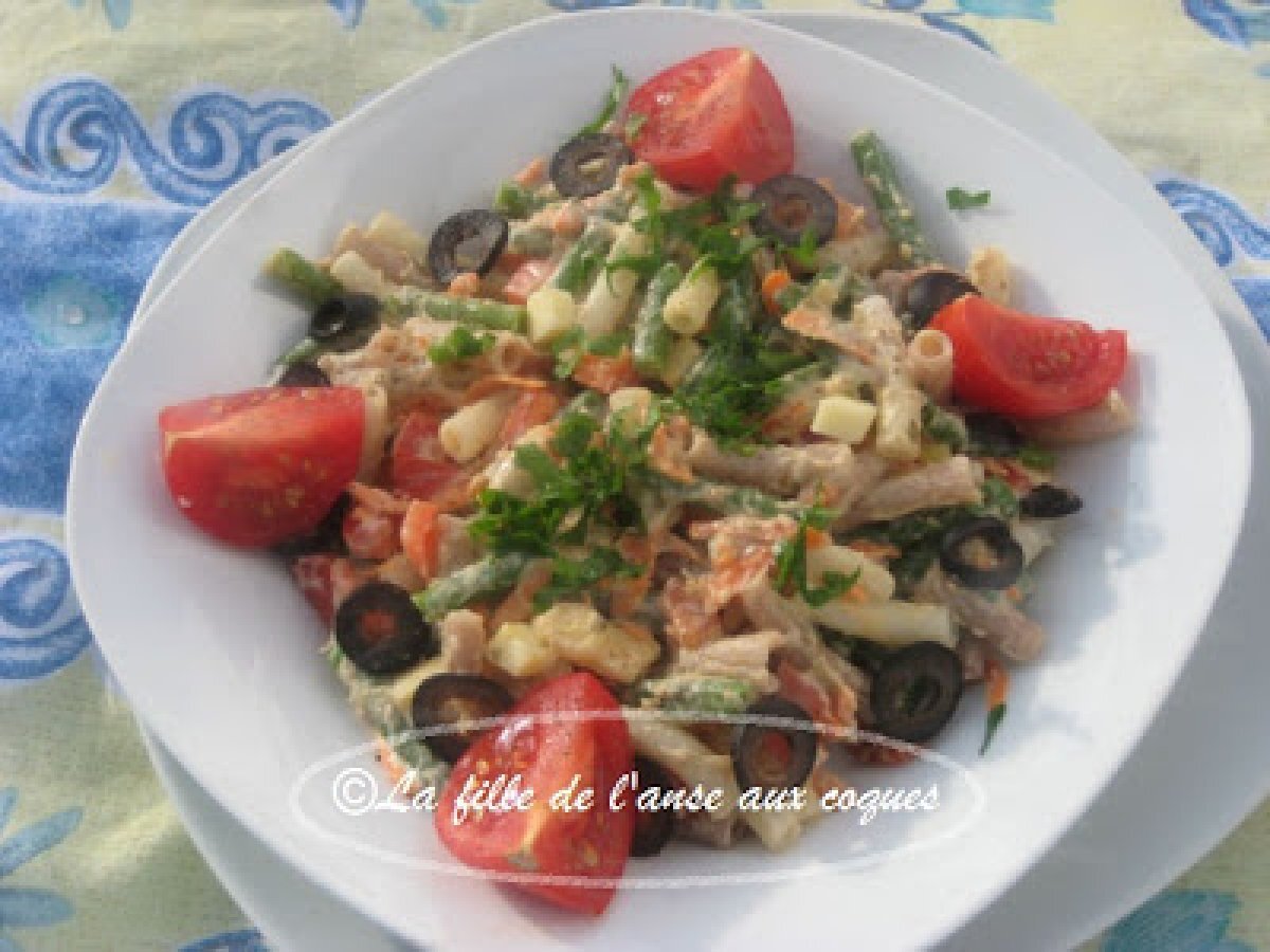 Salade de pâtes et de haricots avec vinaigrette de thon votez maintenant Platfacile45 min Envoyer cette recette à un ami Imprimer cette page Poser une question à l'auteur Publier votre photo de cette recette Ingrédients 3 1 tasse de petites pâtes courtes ½ lbde haricots verts frais ou surgelés 1 tassede poivron rouge, haché 1 tasse de carottes, râpées 2 oignons verts, hachés Ajout d?½ -¾ tasse Vinaigrette: 1 boîte de 6 oz de thon dans l?eau, égoutté ½ tasse de mayonnaise ¼ tasse de yogourt nature ¼ tasse d'huile d?olive 1-2 c. à thé de purée d?anchois 2 c. à soupe de câpres, égouttées 2 c. à soupe de jus de citron