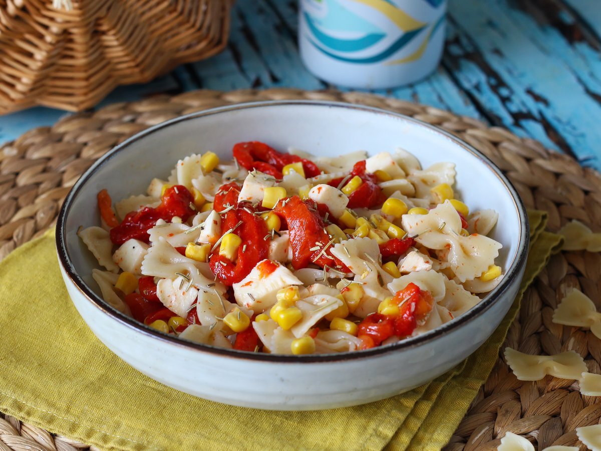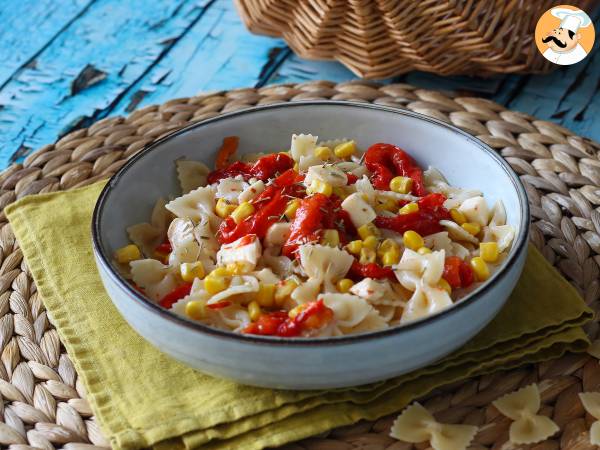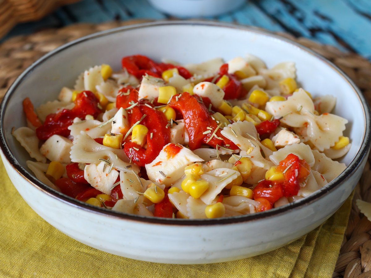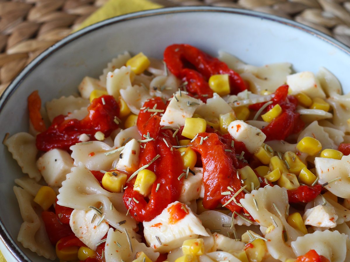 Salade de pâtes froide aux poivrons, maïs et mozzarella