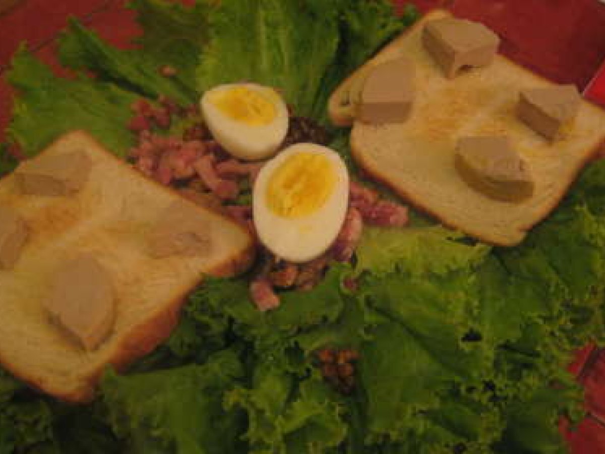 Salade et toast au foie gras Platfacile25 min385 Kcal Envoyer cette recette à un ami Imprimer cette page Poser une question à l'auteur Publier votre photo de cette recette Ingrédients 4 1 salade 100gr de foie gras 2 oeufs durs 1 poignée de noix 100gr de lardons Vinaigrette 4 tranches de pain de mie