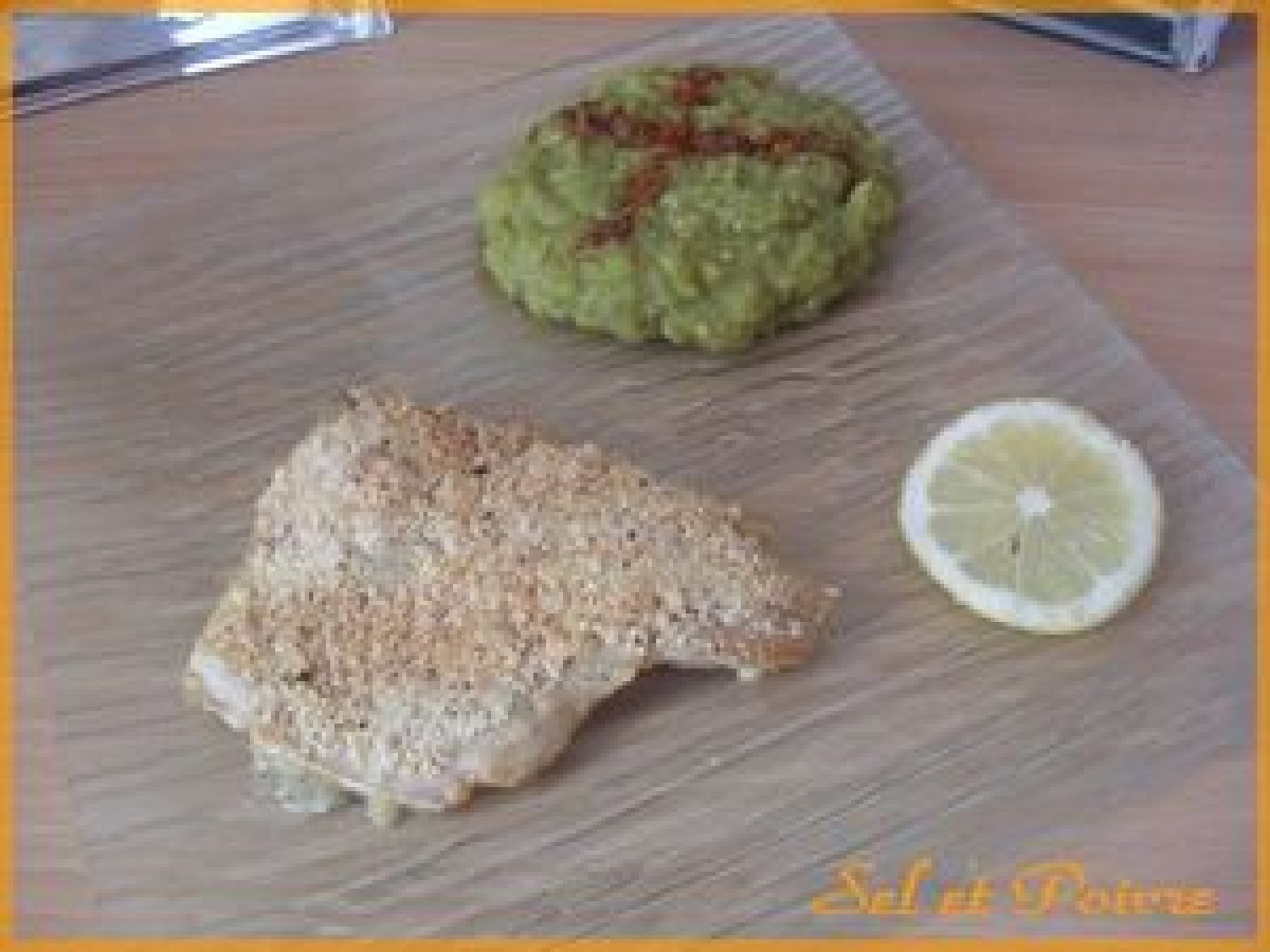 Sandre en croûte de crumble de pain au citron et purée de pois cassés