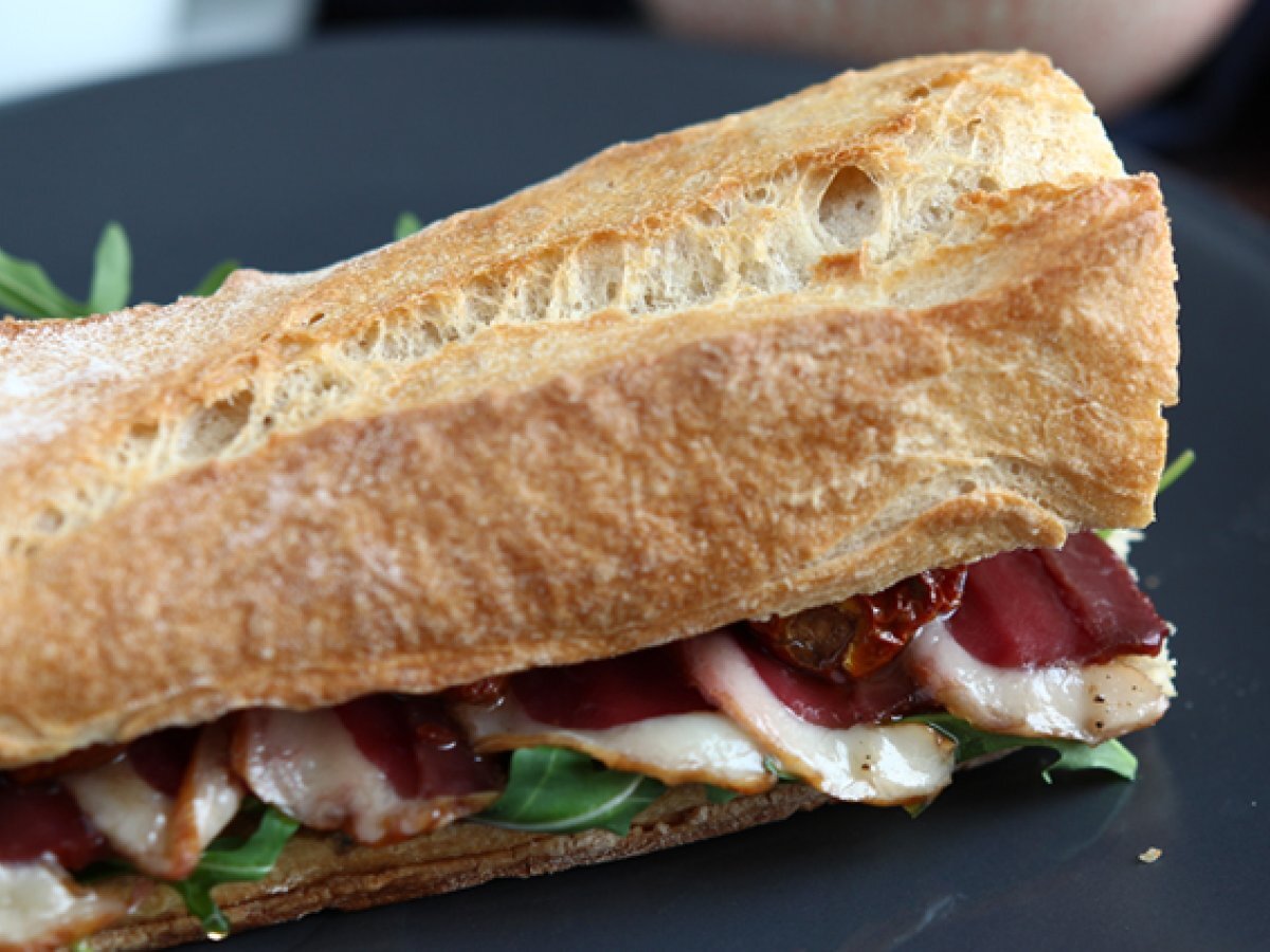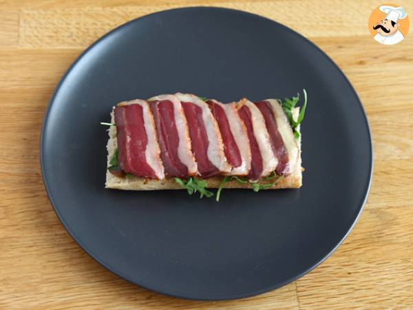 Sandwich au magret fumé, tomates séchées, roquette et balsamique