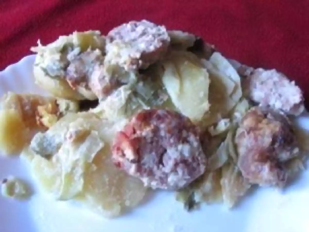 Saucisse de morteau en gratin de pommes de terre et poireau