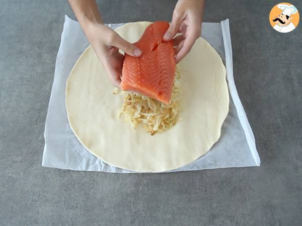 Au centre d'une pâte feuilletée, déposer les oignons cuits puis le saumon cru (sans peau ni arrêtes). Assaisonner avec du sel et du poivre.