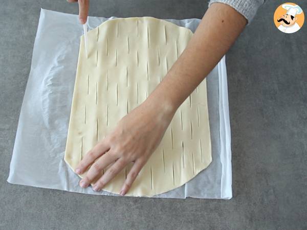 Dérouler la deuxième pâte feuilletée et la couper pour la rendre carrée. Couper des petites lignes verticales en les espaçant les unes des autres et espacer en quinconces. Regarder la vidéo pour une meilleure compréhension.