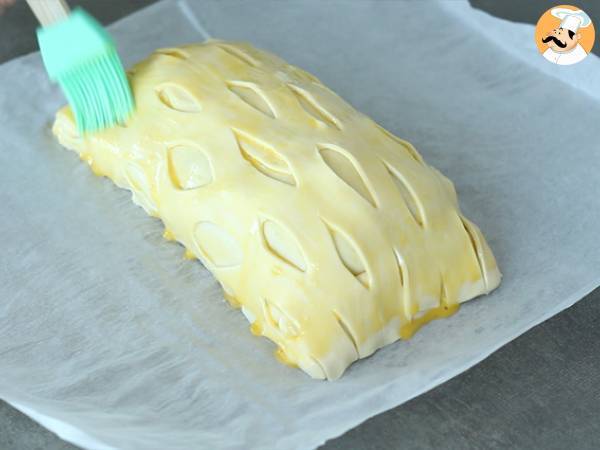 Badigeonner le dessus avec de l’œuf battu et mettre au four 30 minutes à 180°C.