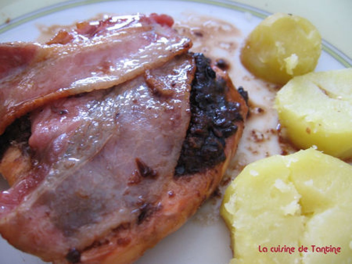Saumon en croûte de tapenade votez maintenant PrécédentSuivant Platfacile55 min505 Kcal Envoyer cette recette à un ami Imprimer cette page Poser une question à l'auteur Publier votre photo de cette recette Ingrédients 4 4 pavés de saumon sans peau 200 g d'olives dénoyautées 4 fines tranches de lard fumé 1 gousse d'ail 5 brins de thym huile d'olive sel poivre 800 g de pommes de terre à chair ferme Coût estimé: 13.03Euros€ (3.26€/part)