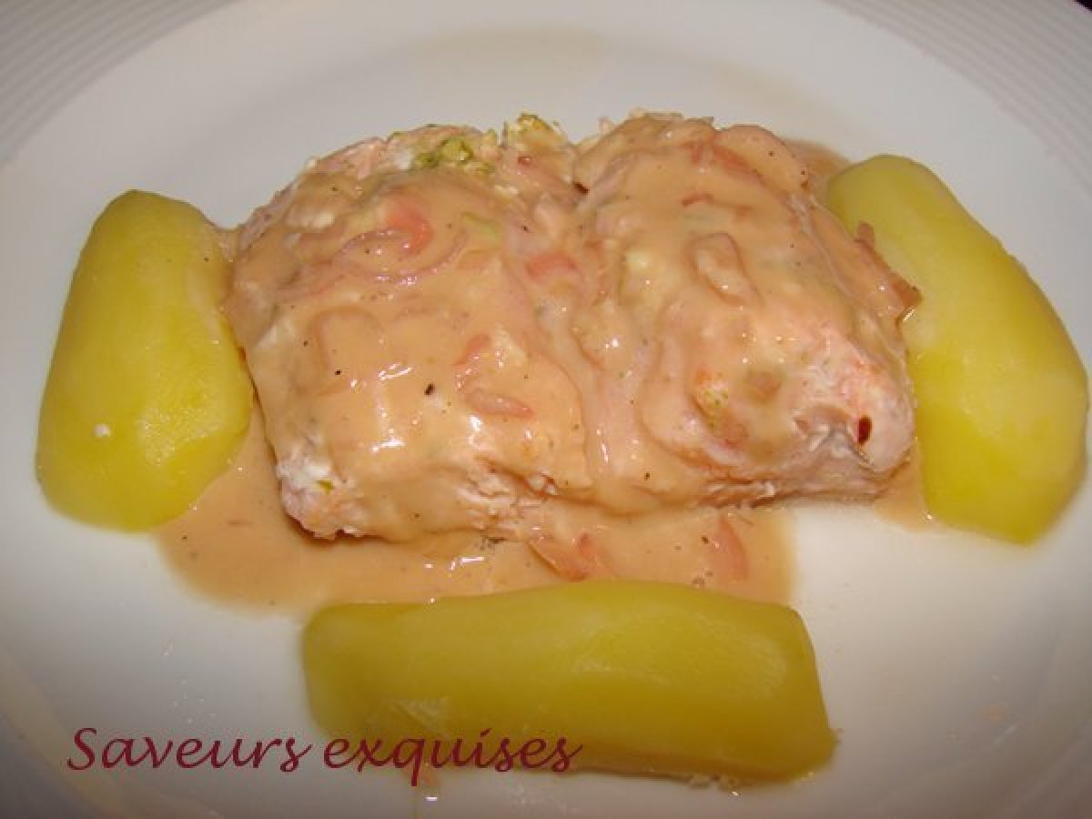 Saumon en papillote au citron vert Platmoyen20 min Envoyer cette recette à un ami Imprimer cette page Poser une question à l'auteur Publier votre photo de cette recette Ingrédients 4 800 g de saumon ( 4 escalopes sans peau et sans arrêtes) 1 citron vert 1 grosse échalote 80 g de beurre 0,5 dl de crème double 0,5 dl de porto racine de gingembre ( facultatif) sel et poivre, poivre de cayenne