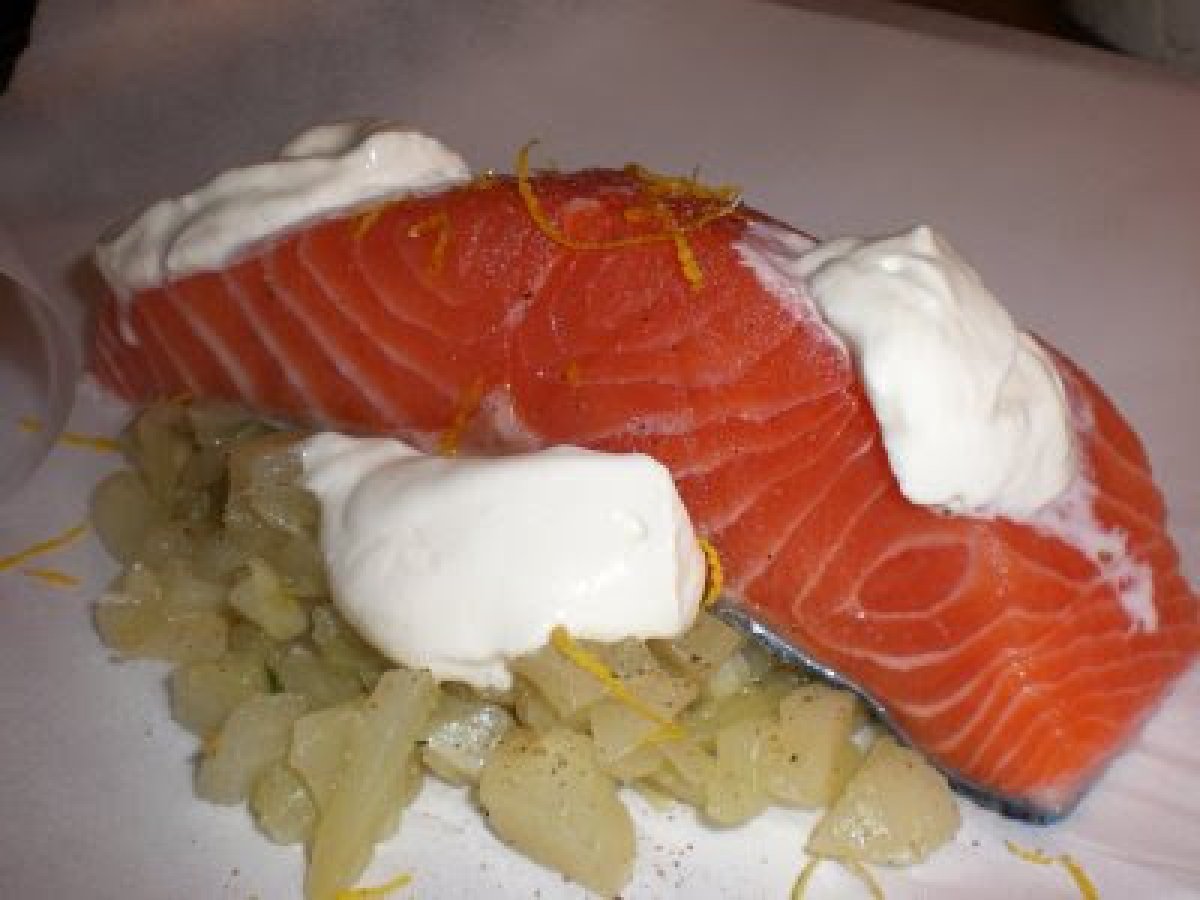 Saumon en papillote sur un lit de dès de fenouil citronné