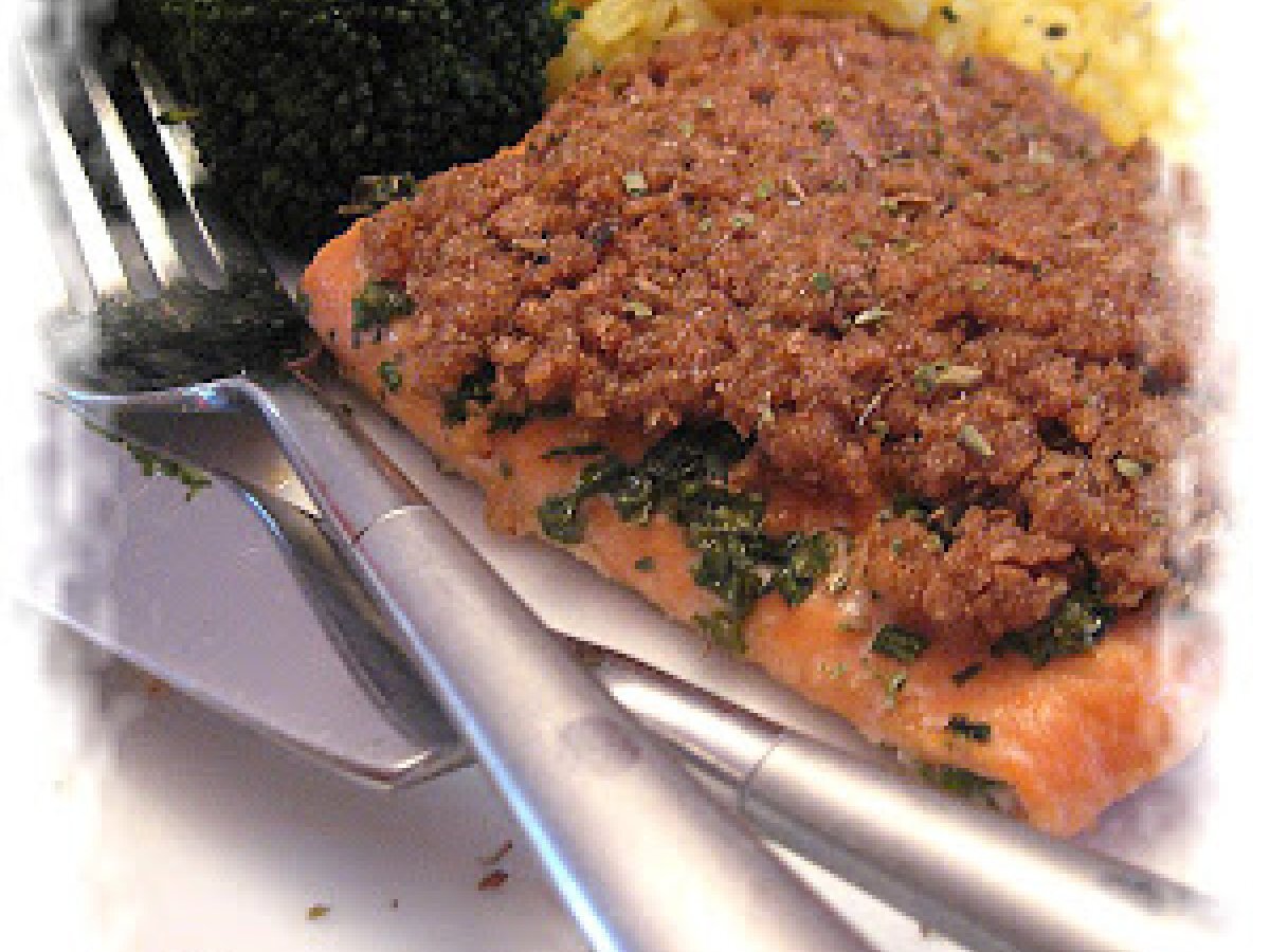 Un saumon tendre à souhait mariné quelques heures dans du vinaigre de cidre, ciboulette et cassonade, ensuite on prépare une petite croûte crousti-craquante de seigle sucré, on le recouvre, hop au four et le tour est joué. Franchement c'est simple non. Un véritable régal!