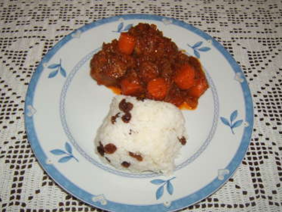 Sauté d'agneau au riz Platmoyen1 h 15 m Envoyer cette recette à un ami Imprimer cette page Poser une question à l'auteur Publier votre photo de cette recette Ingrédients 2 350 g d'agneau coupé en cube, 1 oignon, 1 feuille de laurier, 1 clou de girofle, 1 cube de bouillon de volaille, 2 tomates fraîches, 2 c-à-c de concentrée de tomate, Carottes, Bouquet garni, 1 gousse d'ail, Poivre, Persil haché. Riz, Raisin sec.