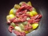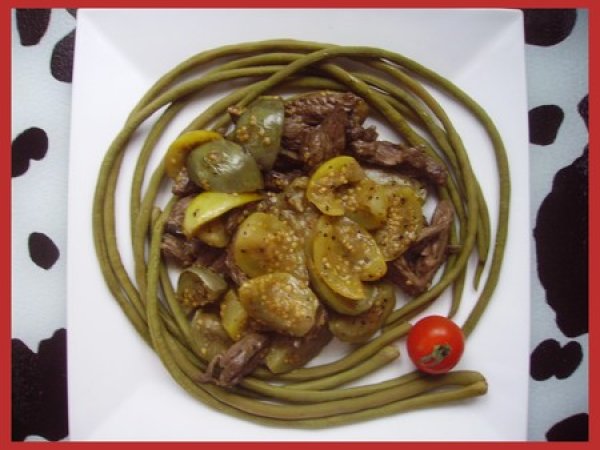 Sauté de boeuf aux aubergines jaunes, blanches et haricots verts longs