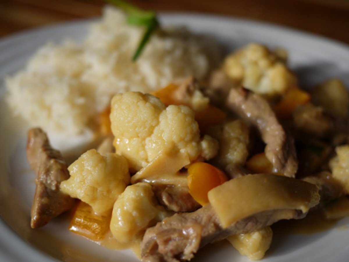 Sauté de porc et légumes au lait de coco votez maintenant Platfacile40 min Envoyer cette recette à un ami Imprimer cette page Poser une question à l'auteur Publier votre photo de cette recette Ingrédients 1 1 filet de porc 1 cuillère à table d’huile de pépins de raisins 2-3 gousses d’ail, pelées et émincées 1 cuillère à thé de sauce nuoc-mâm 1 poivron orange, épépiné et coupé en morceaux 400 ml de lait de coco 1/4 cuillère à thé de cari rouge ou vert 1 chou-fleur, défait en fleurettes 1 boîte de pousses de bambou, égouttées 10 tiges de ciboulette, hachées Sucre