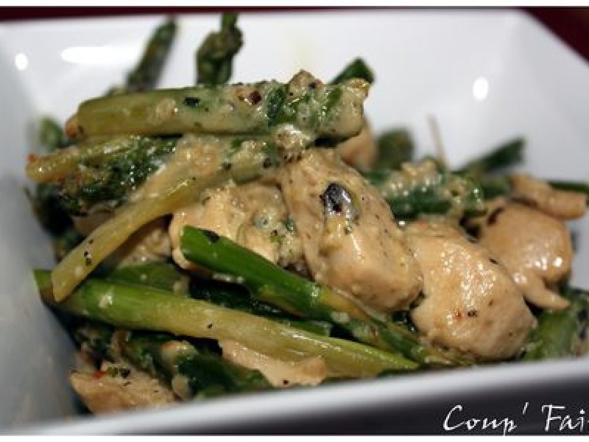 Sauté de poulet aux asperges et origan ... Platmoyen35 min393 Kcal Envoyer cette recette à un ami Imprimer cette page Poser une question à l'auteur Publier votre photo de cette recette Ingrédients 2 +/- 250 g de poulet en émincé 500 g d'asperges vertes (du Valais) 1.5 dl de demi-crème 1 dl de bouillon de légumes 1 petit oignon 1 gousses d'ail 2 cuillères à soupe d'origan sel et poivre