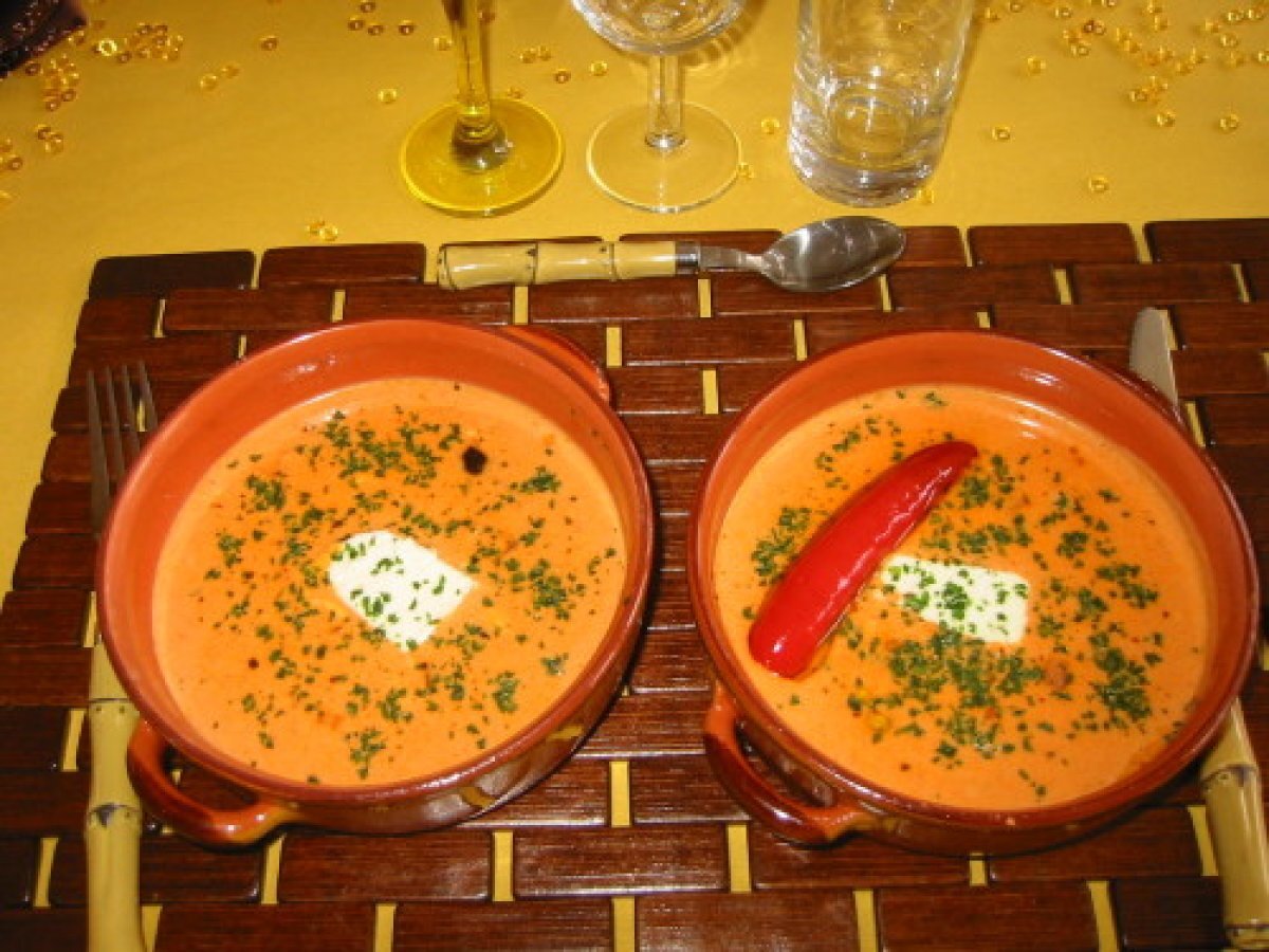 - Laisser mijoter sur le feu et faire épaissir légèrement avec la maïzena, ajouter les scampis, remettre à cuire environ 2 minutes, retirer la poêle du feu, servir chaud.