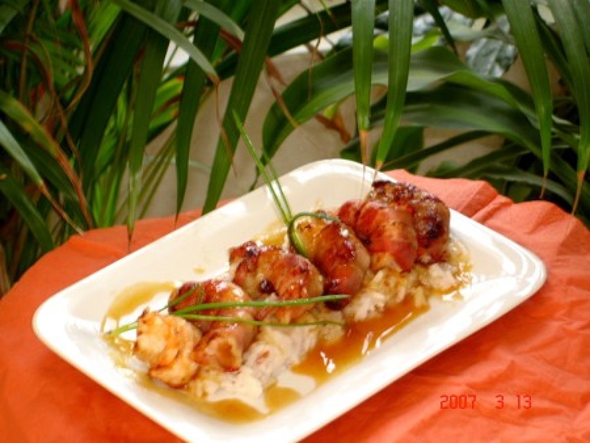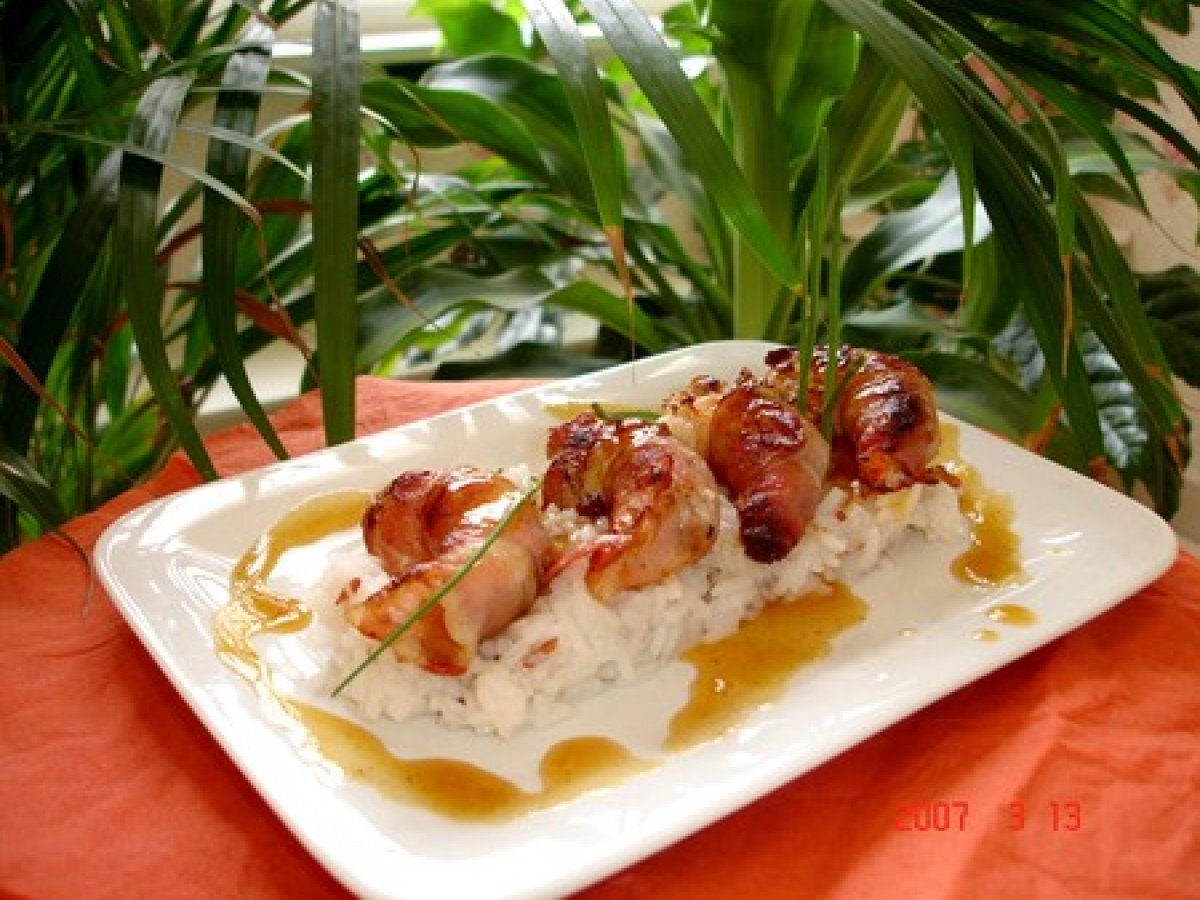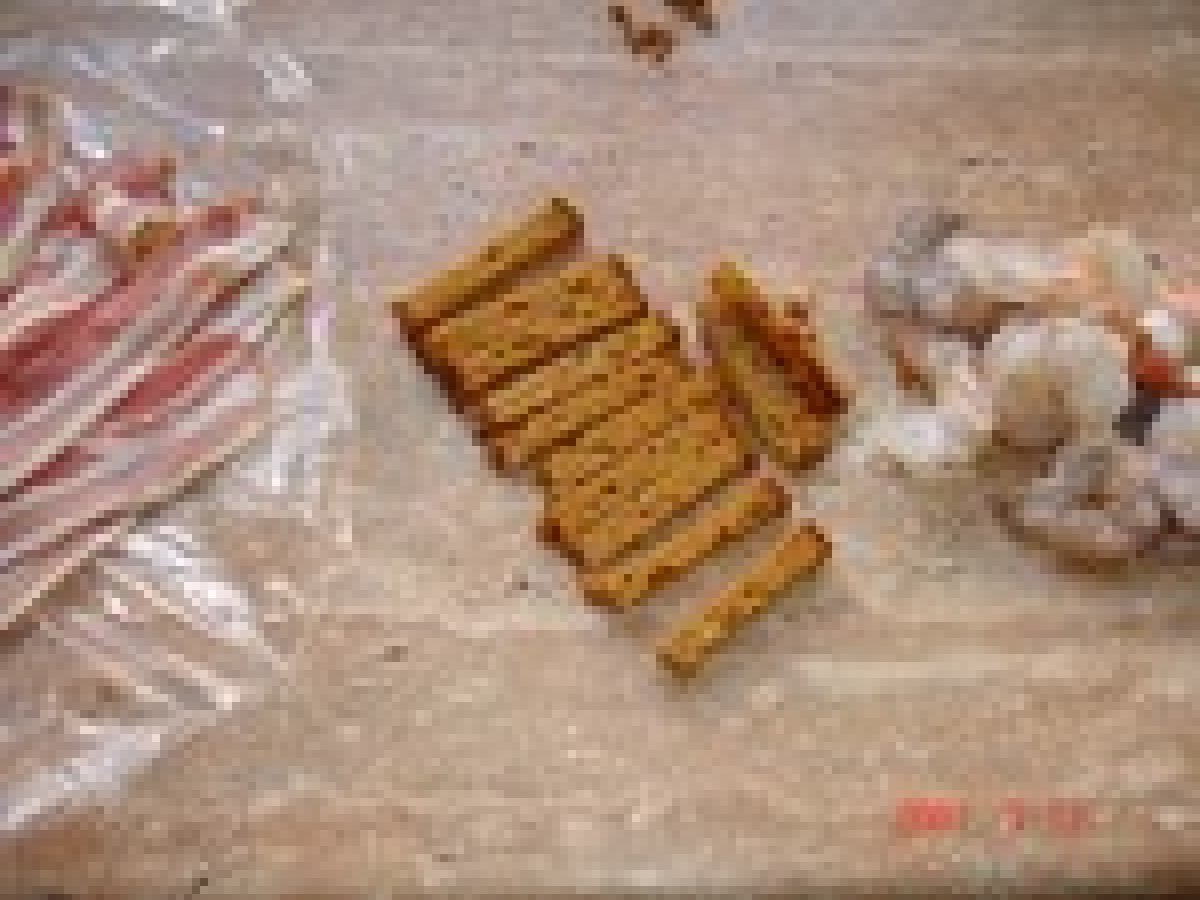 Couper une tranche de pain d'épice en fines lamelles pour en avoir 12 - Mettre une lamelle sur le dos du scampis et l'enrouler de la tranche de lard