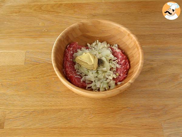 Mélanger la chair à saucisse avec l'oignon émincé finement, l'ail coupé en morceaux, et la moutarde. Saler et poivrer.