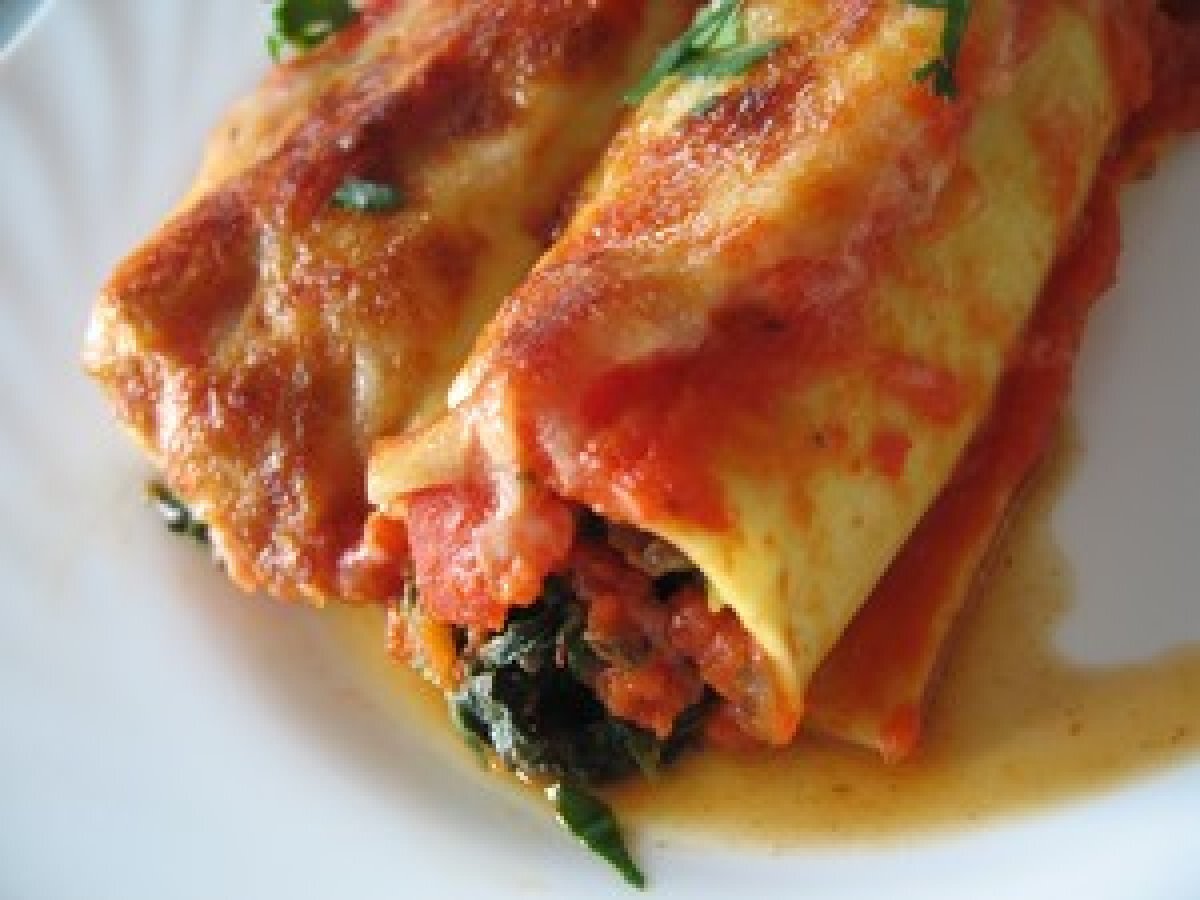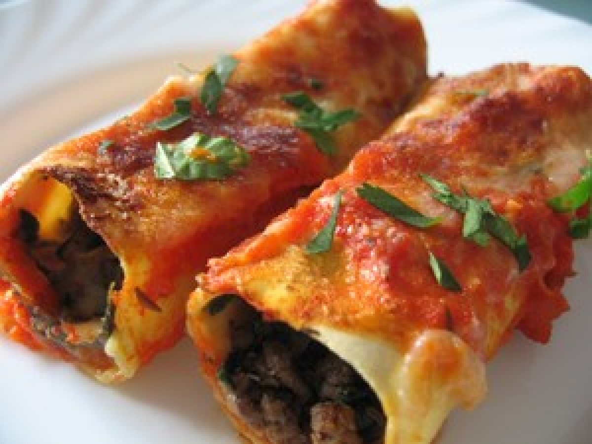 Couper les feuilles de lasagnes en deux dans la largeur. Déposer de la farce et rouler. - Finir de bien remplir par les côtés. Déposer dans le plat les cannellonis et verser dessus le reste de la sauce tomate. Enfin verser la béchamel et parsemer de parmesan râpé. Enfourner 25 minutes.