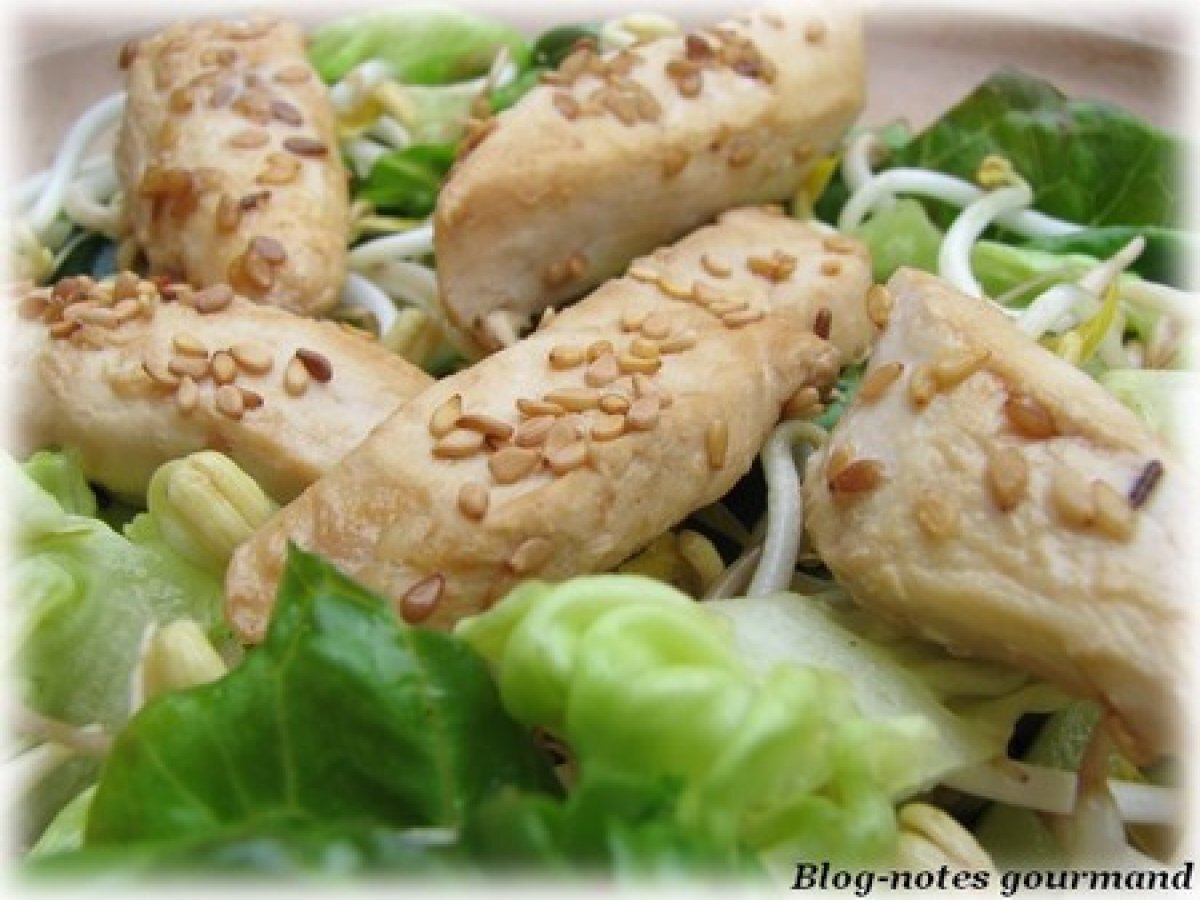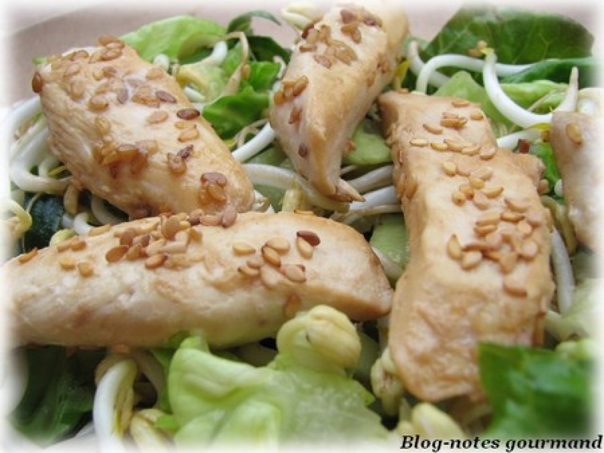Soudaine prise de conscience et salade de poulet à l'asiatique PrécédentSuivant Platfacile15 min Envoyer cette recette à un ami Imprimer cette page Poser une question à l'auteur Publier votre photo de cette recette Un désir de manger "mieux": salade de poulet à l'asiatique. Ingrédients 2 2 blancs de poulet 1 càs de moutarde 3 càs de sauce soja 2 càs de jus de citron 2 càs de graines de sésame 5 belles feuilles de salade 1 tronçon de concombre d'environ 15 cm 1 grosse poignée de germes de soja poivre coriandre