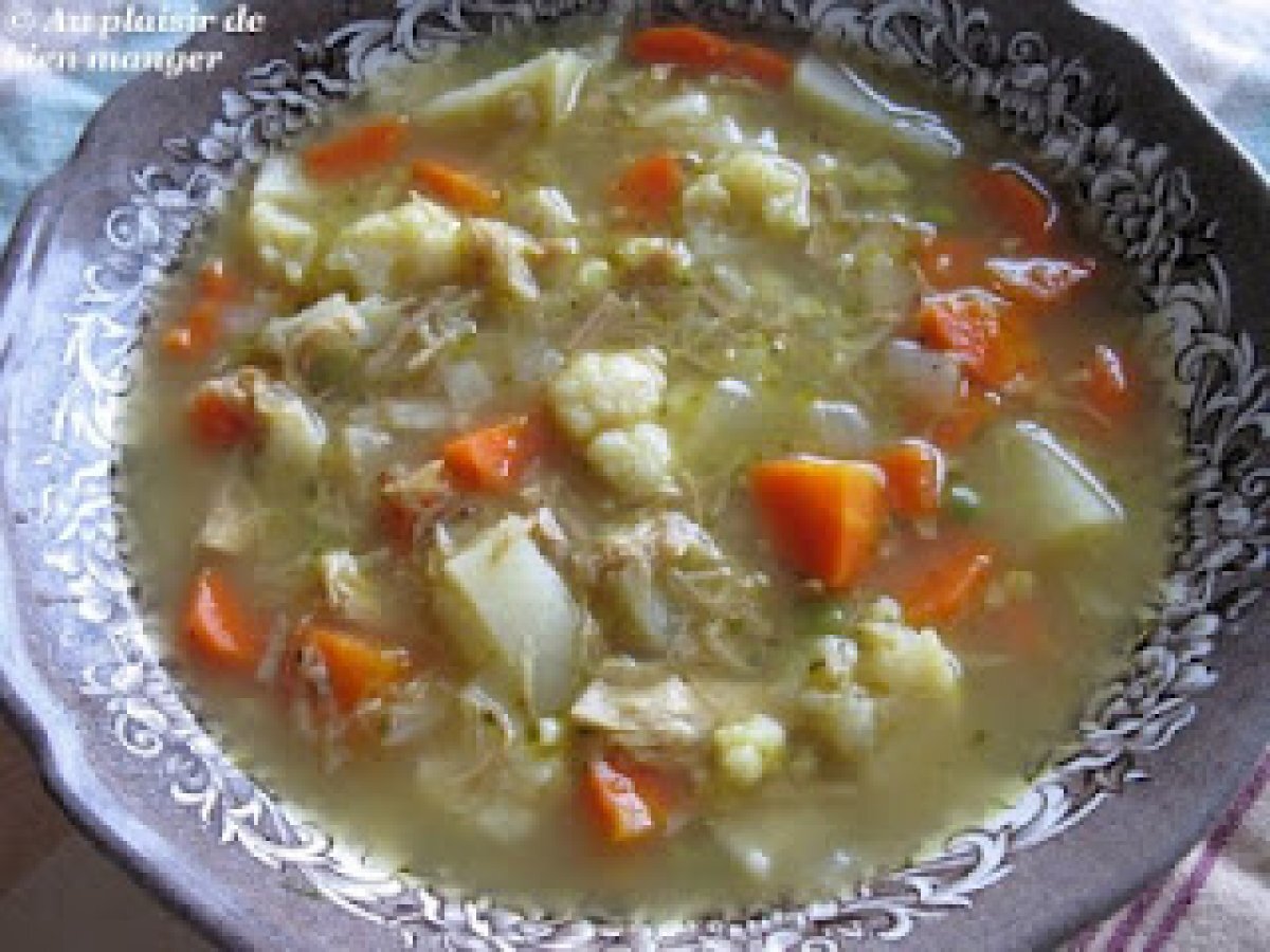 Soupe au poulet, au chou-fleur et au cari Platfacile26 min Envoyer cette recette à un ami Imprimer cette page Poser une question à l'auteur Publier votre photo de cette recette Ingrédients 4 2 cuillères à table huile végétale ou beurre (30 ml) 2 poitrines de poulet désossées, la peau et le gras enlevés, coupées en cubes 1 chou-fleur coupé en bouquets (petit) 2 oignons hachés finement 2 gousses d'ail broyées 3 carottes coupées en petits dés 2 pommes de terre coupées en petits dés 2 cuillères à thé cumin moulu (10 ml) 2 cuillères à thé de coriandre moulu (10 ml) 2 cuillères à thé de cari (10 ml) 6 tasses de bouillons de poulet (1.5 L) 1 tasse de petits pois surgelés (250 ml) 1/4 tasse persil frais, haché (60 ml) sel poivre noir du moulin