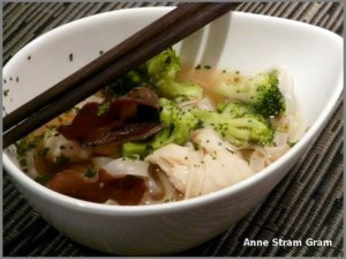 Soupe aux nouilles de riz, cabillaud et brocoli