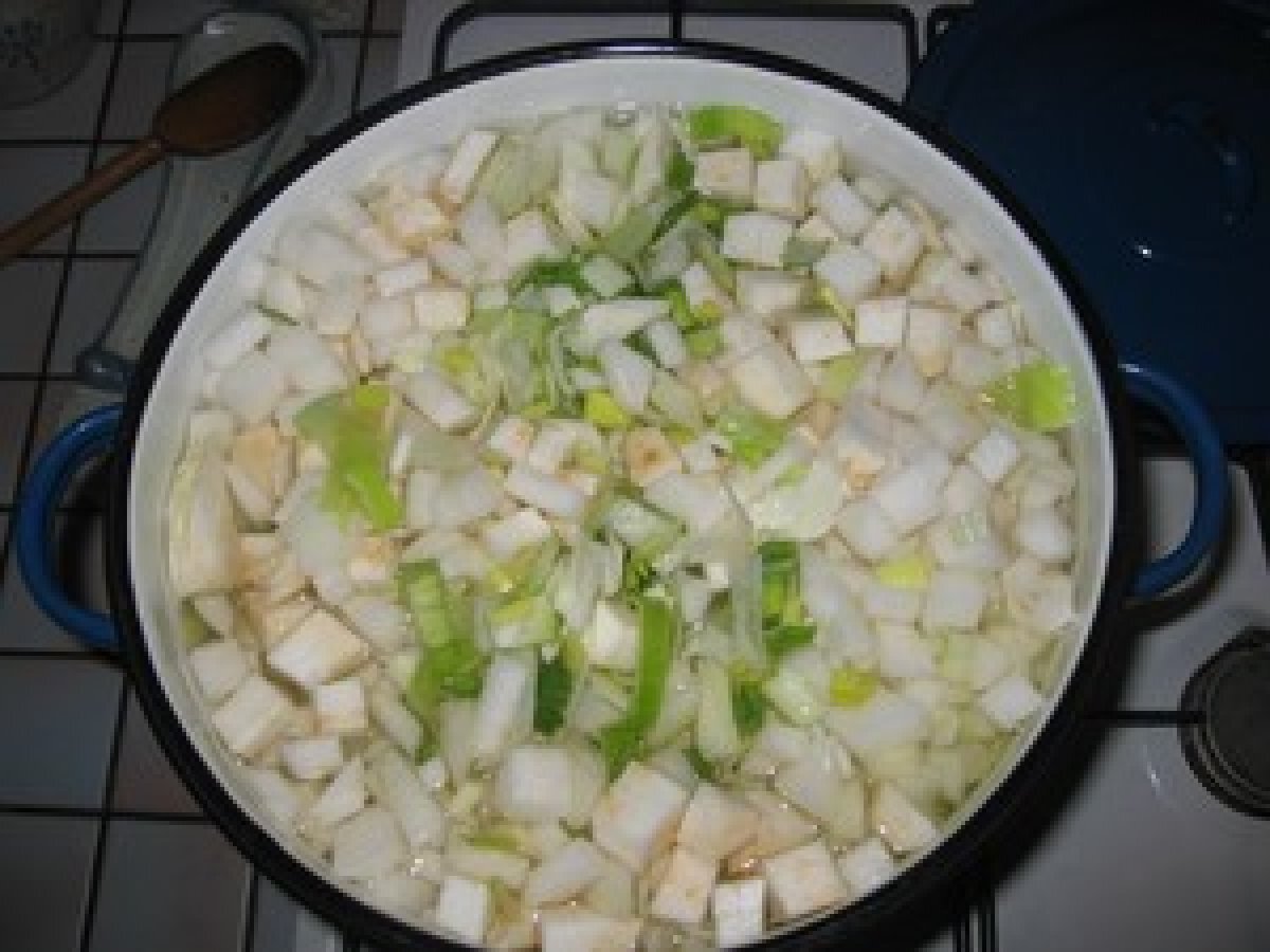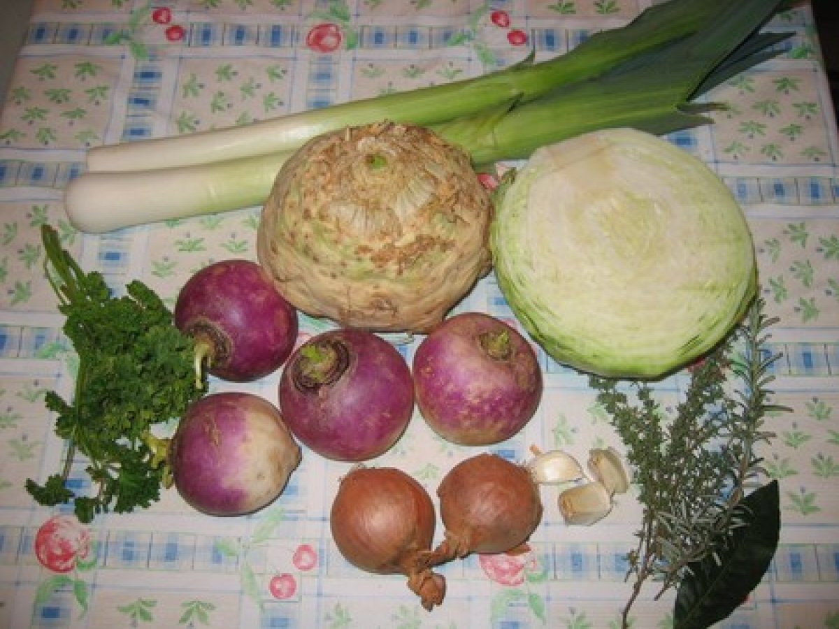 Soupe de légumes en vert et blanc sans féculents (m) PrécédentSuivant Platfacile2 h 45 m172 Kcal Envoyer cette recette à un ami Imprimer cette page Poser une question à l'auteur Publier votre photo de cette recette Une grosse envie de soupe ! le voici!! Ingrédients 4 2 beaux poireaux 1 boule de céleri rave 4 navets 1/2 chou pomme 2 gros oignons 3 gousses d'ail 5 brins de thym 4 brins de persil 1 brin de romarin 1 feuille de laurier sel poivre 5 litres d'eau