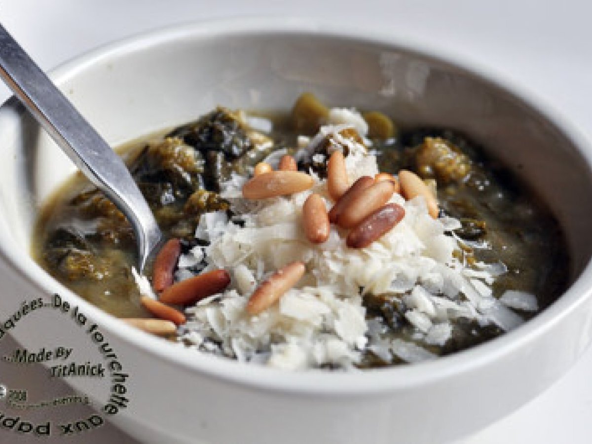 Soupe épinards, brocoli, pommes de terre, oignons, pignons et fromage Platfacile50 min Envoyer cette recette à un ami Imprimer cette page Poser une question à l'auteur Publier votre photo de cette recette Ingrédients 4 1 pied de brocoli 1 oignon 1 gousse d'ail 300 g d'épinards 2 pommes de terre 1 bouillon cube de volaille 900 ml d'eau ½ citron Huile d'olive Muscade 80 à 100 g de pignons 100 g de parmesan Sel et poivre