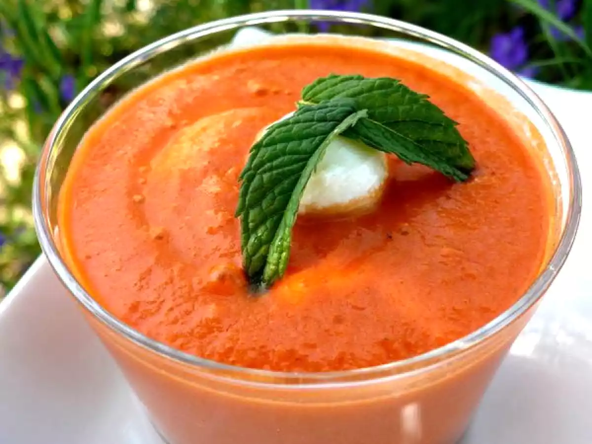 Soupe froide tomates - poivrons à la mozzarella PrécédentSuivant Platmoyen25 min Envoyer cette recette à un ami Imprimer cette page Poser une question à l'auteur Publier votre photo de cette recette Une fabuleuse entrée tout en fraîcheur et délicatesse ! Ingrédients 6 3 poivrons rouges 1 kg de tomates 1 oignon 1 gousse d'ail 1 boîte de chavroux 3 cuillères à soupe de ricotta 6 billes de mozzarelle 6 feuilles de basilic + 6 pour la déco 2 cuillères à soupe d'huile d'olive 1 pincée de sucre sel, poivre