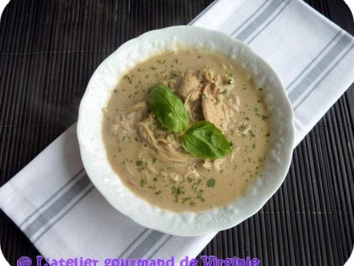Soupe thaï nouilles et poulet, merci ken hom!! Platfacile28 min511 Kcal Envoyer cette recette à un ami Imprimer cette page Poser une question à l'auteur Publier votre photo de cette recette Ingrédients 4 3 filets de poulet 125 g de nouilles 1 litre de bouillon de poulet 40 cl de lait de coco 2 tiges de citronnelle 1 petit oignon finement émincé 2 cuillères à soupe d'huile végétale 2 cuillères à soupe de curry de madras 1 cuillère à soupe de sauce soja noire 1 cuillère à soupe de sauce de poisson 1 cuillère à soupe de sucre en poudre 1/2 cuillère à café de sel 1/2 cuillère à café de poivre 1 petit piment thaï rouge ou vert finement émincé en lamelles Quelques feuilles de coriandre fraîche et de basilic Coût estimé: 11.19Euros€ (2.8€/part)