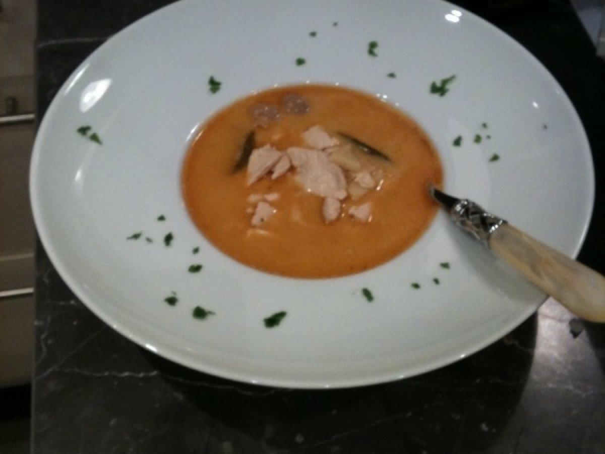 Soupe thaïlandais à la noix de coco et curry rouge Platmoyen1 heure Envoyer cette recette à un ami Imprimer cette page Poser une question à l'auteur Publier votre photo de cette recette Ingrédients 4 Pour 4 personnes 600 ml de lait de noix de coco 2 cs à soupe de curry rouge (la pâte est en vente dans les épiceries asiatique) - j'en mets plus car j'aime la cuisine épicée. Si ce n'est pas votre cas, essayer tout d'abord avec deux cuillerées à café...mais ce sera moins goûteux. 1 cs de curcuma (ingrédient indispensable dans cette préparation) 450 gr de poulet 600 ml de bouillon de poule 4 cs de nuoc nam 1 cs de sauce de soja le jus d'un à deux citrons ou limes 450 gr de nouilles "jaunes" chinoises ou si vous préférez au riz 50 gr de pousses de soja un bon morceau de gingembre coupé en fines lamelles 3 "spring onions" dans les épiceries asiatiques, on peut les remplacer par des échalotes 2 cs d'ail que l'on aura coupée en fines lamelles avec une mandoline et grillées dans de l'huile. Attention de ne pas les brûler, cela devient amer. des feuilles de coriandre.