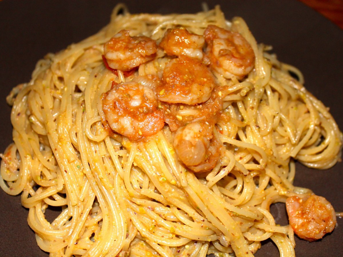 Recette facile à faire si l'on a les ingrédients à la maison. Elle ne demande que très peu de préparation et le résultat est excellent. Le pesto de pistache et le crevette se marient divinement et pour les fin gourmet, une petite touche de vin blanc fera la différence.