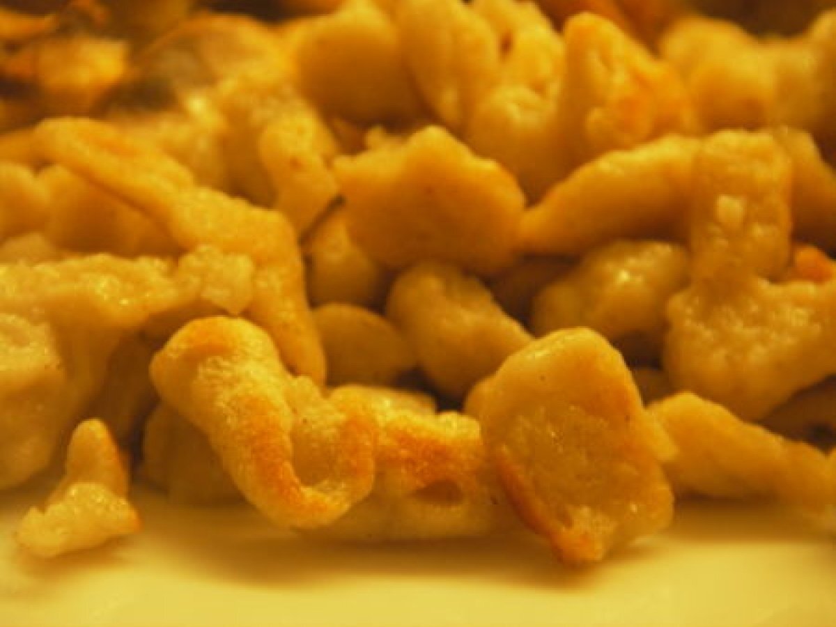 • Dans une poêle, faire fondre un morceau généreux de beurre, ajouter les knepfle lorsqu'il est blond (pas roux, quoi). Faire revenir doucement, en remuant de temps en temps.