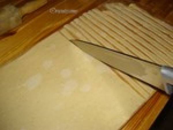 Avec un long couteau mouillé, découpez la pâte en bandelettes étroites et faites-les glisser dans l'eau depuis un coin de la planche. Dès qu'elles remontent à la surface, sortez les de l'eau avec une écumoire et transférez-les dans un plat allant au four. Gardez-les au chaud dans le four.