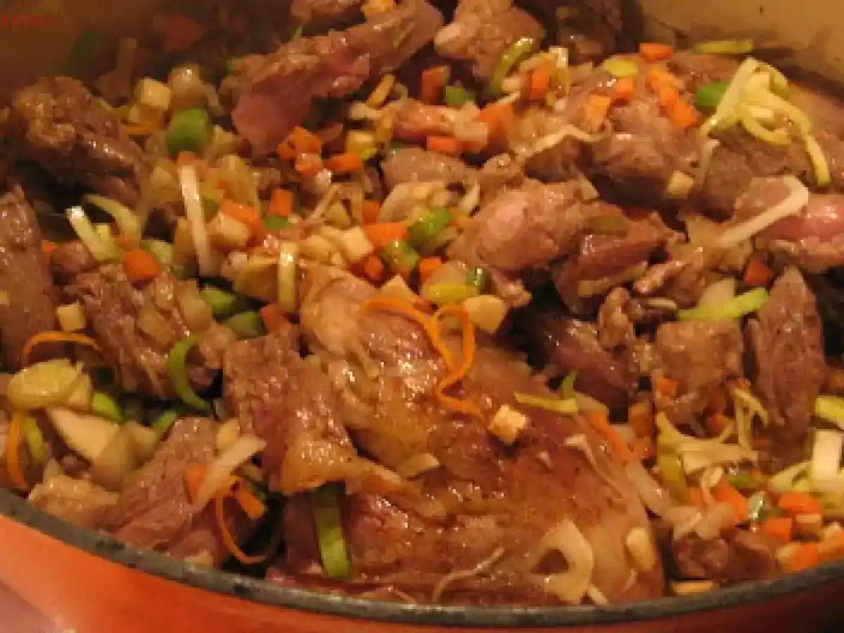 - Ajoutez ensuite les légumes en dés ( carottes,zeste d'orange, persil, poireaux, oignon, ail, tomate, racine de persil, sellerie en branche....)et remuez sans cesse. A ce moment, vous pouvez encore ajouter un peu de porto ou bien un très bon balsamico.