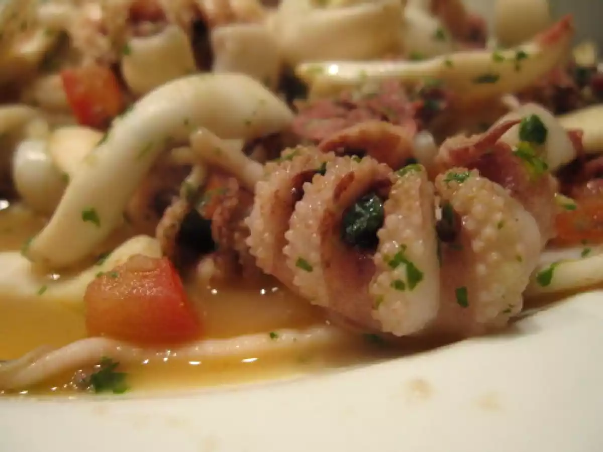- Dans une poêle chauffer l'huile d'olive, ajouter l'ail et les supions, puis le persil ciselé, saler et poivrer, faire revenir 1 à 2 minutes et réserver.