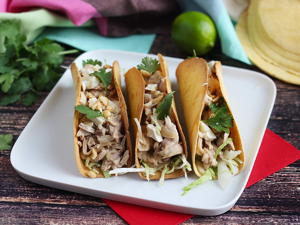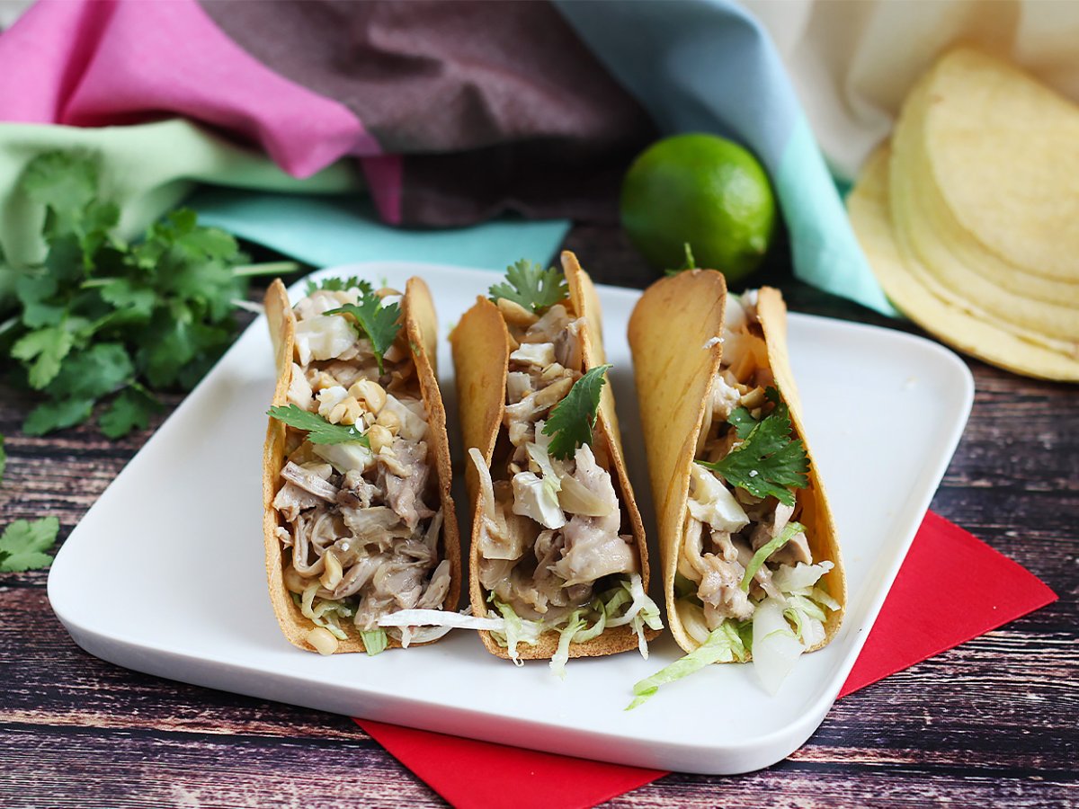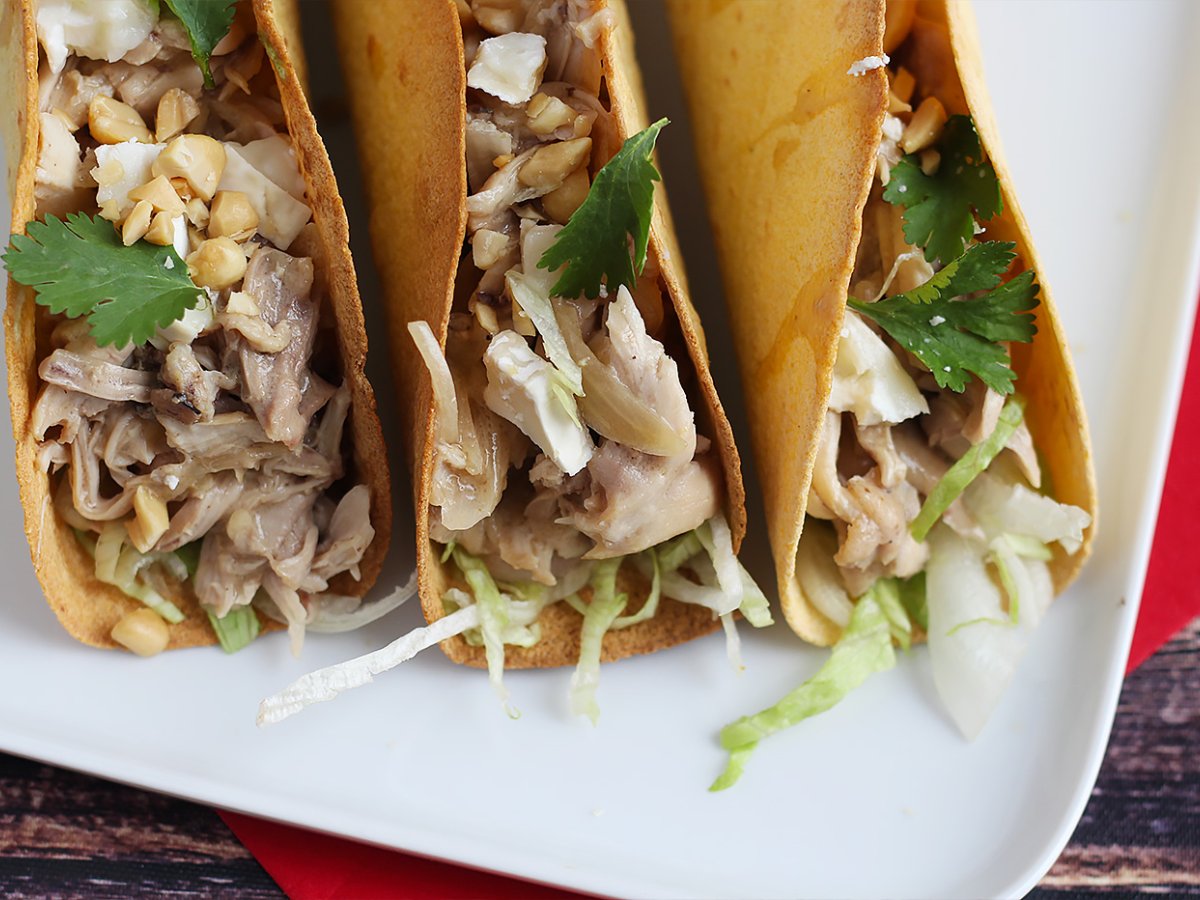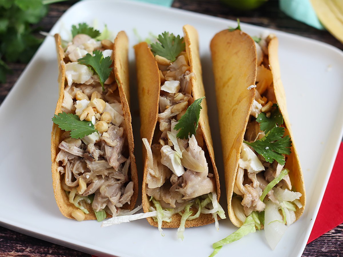 Aujourd'hui, on mixe cuisine mexicaine et thaïlandaise dans cette recette de tacos croustillants garnis de poulet et sauce satay. De quoi préparer un repas original en toute simplicité ;-) La base est très simple : des galettes de blé cuites au four. Pour la garniture, nous avons utilisé des cuisses de poulet qui ont mijotées dans du lait de coco et du beurre de cacahuète. De quoi mettre un peu de soleil dans votre assiette grâce à cette association de saveurs.